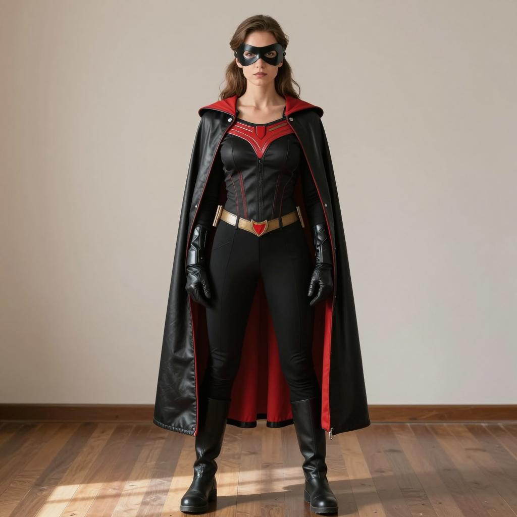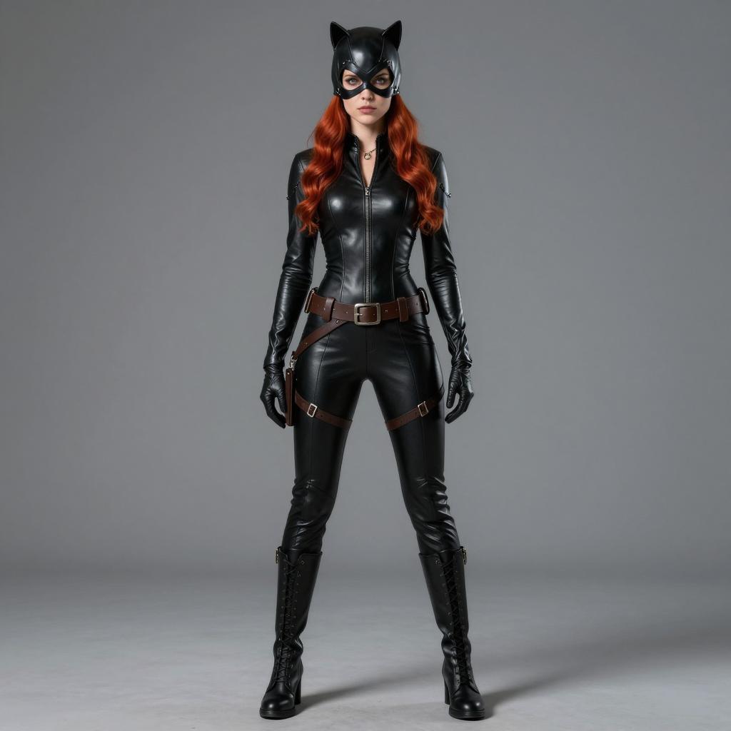 Black widow costume props, photorealistic, close-up portrait of a woman, wearing a detailed black cat mask with cat ears, long wavy brown hair, red lipstick, black and red superhero costume, focus on face, soft background, bright lighting, realistic ures, CGI, superhero cosplay, attractive female, confident expression, detailed costume, realistic skin tones, soft shadows
