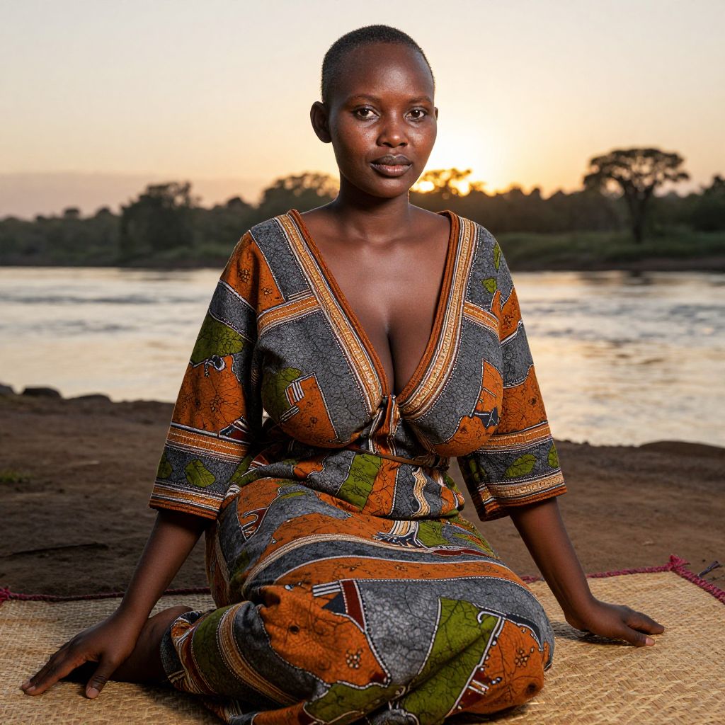 A lush, authentic-looking photo of a Tanzanian tribal-inspired woman in traditional earthy patterned garments, the patterns resembling tribal maps and nature motifs with natural colors like burnt orange, forest gray, and moss green; she is sitting on a woven mat near a riverbank at sunrise, her face softly lit, with a calm and grounded expression, full facial features and subtle facial markings.. The woman has big tits and cute face