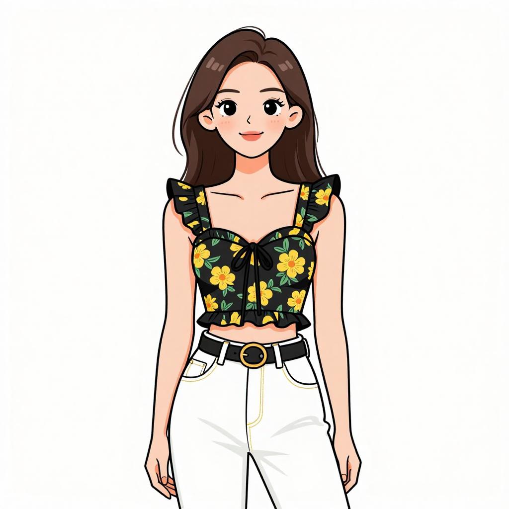 Woman with pretty face and pretty hair. smiling Woman, street fashion, pale yellow lace crop top, V-neckline, scalloped edges, black wide-leg cargo pants, contrast stitching, oversized pockets, black platform boots, yellow and black graphic print belt, held in hand, clean white studio background --sref 1467