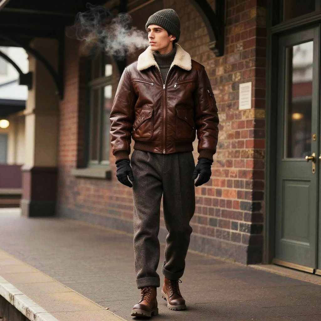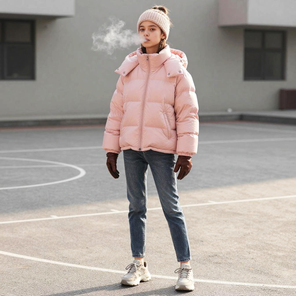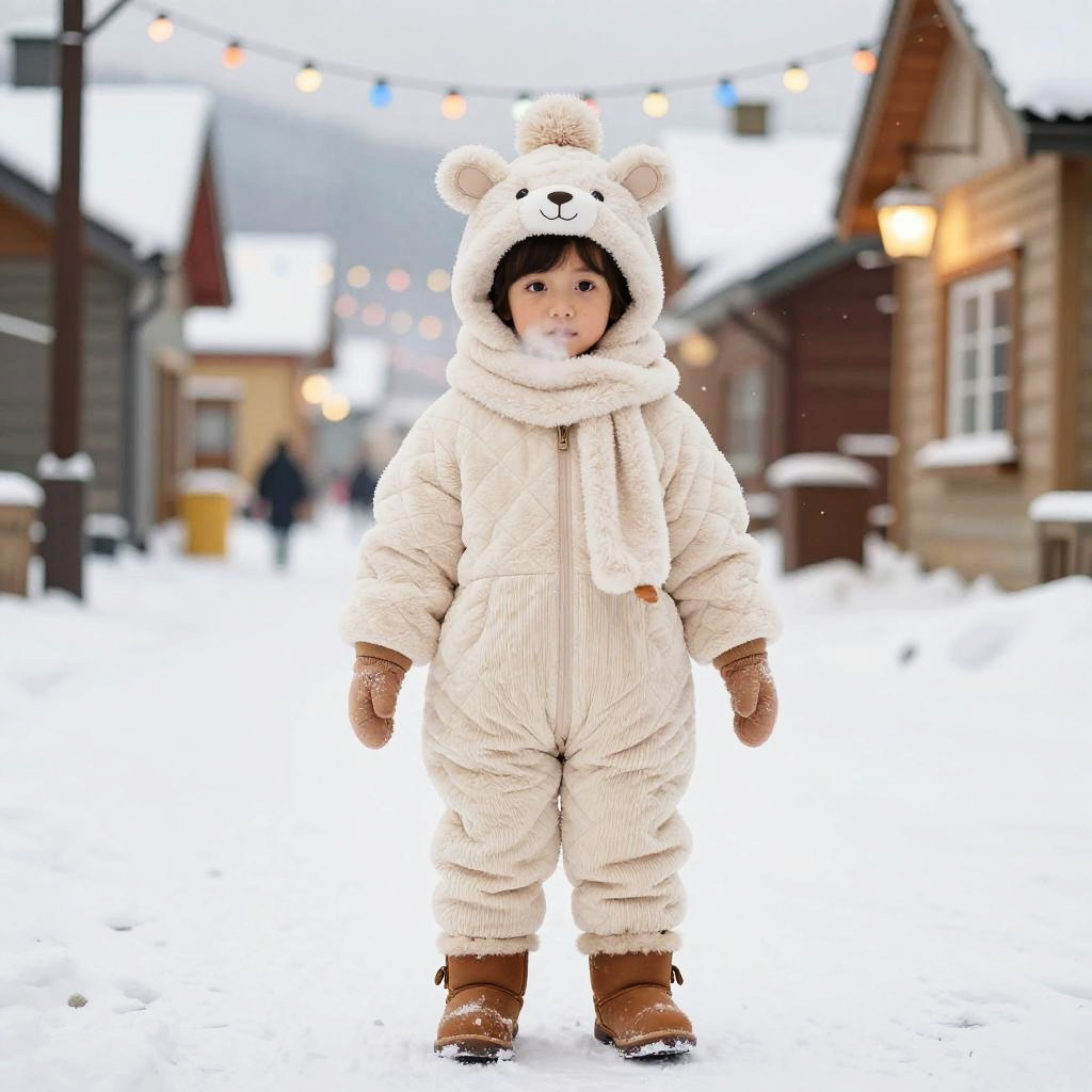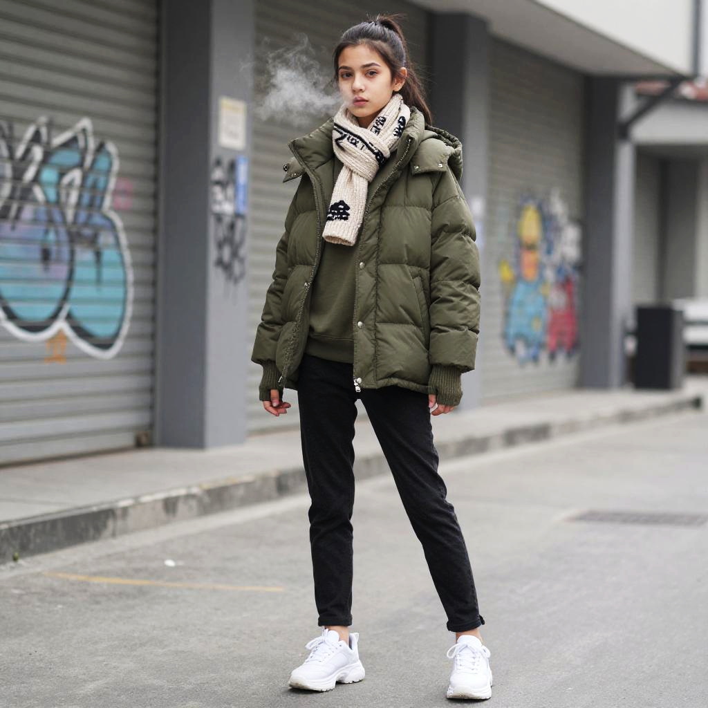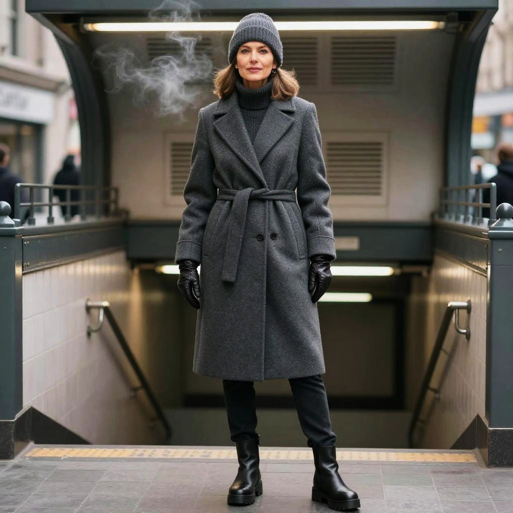 Woman in elegant cold-weather wear, contemporary cold-weather editorial, cream-colored quilted belted jacket, styled with sleek trousers or jeans, thick-soled boots, fingerless gloves, knit beanie; luxury boutique window display at twilight, soft rim light, subtle bounce, gentle shadows, shallow depth of field, visible breath, crisp quilted textures, high detail, color-graded tones, full-body composition, confident stance, clean lines, minimal clutter, premium fabric realism, commercial lookbook vibe