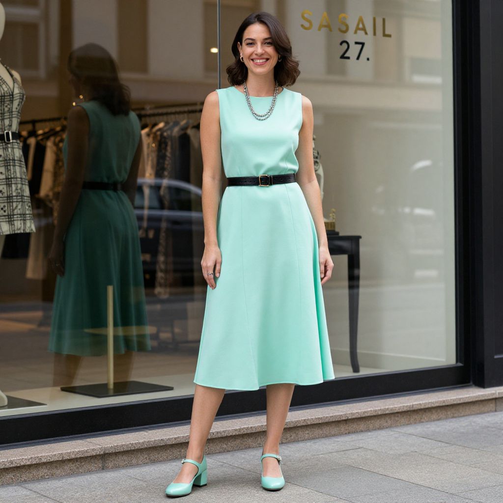 Woman smiling brightly while showcasing a vibrant mint-green sleeveless dress paired with matching Mary Jane heels, complemented by a black belt and layered necklace, standing outside a storefront window labeled \"SASAIL 27.\