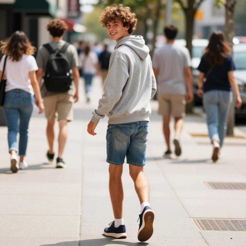 Rear view of a sophisticated, calm young woman, age 25, walking on a busy sidewalk, looking back over her shoulder with a big smile. She has an oval, serene face with smooth, shoulder-length auburn hair and hazel eyes. Dressed in a cream silk blouse, taupe tailored trousers, beige loafers, she exudes a youthful, chic vibe. Captured on a cloudy afternoon with a peaceful city park backdrop, the scene highlights her slender figure, graceful hands, natural pale bronze skin tone. Shot in high resolution, with a focus on dynamic, fluid movement and detailed facial expression for a realistic, professional photo.