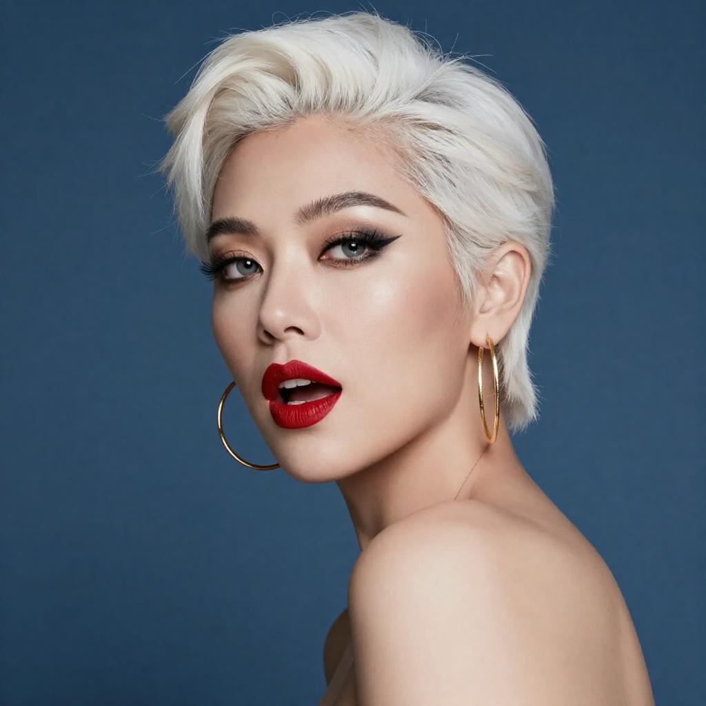 Photograph of a white-haired woman with heavy makeup, red lipstick, and dramatic black eyeliner. She has large, bold eyebrows, gold hoop earrings, and is looking back over her shoulder with an open mouth. Blue background.