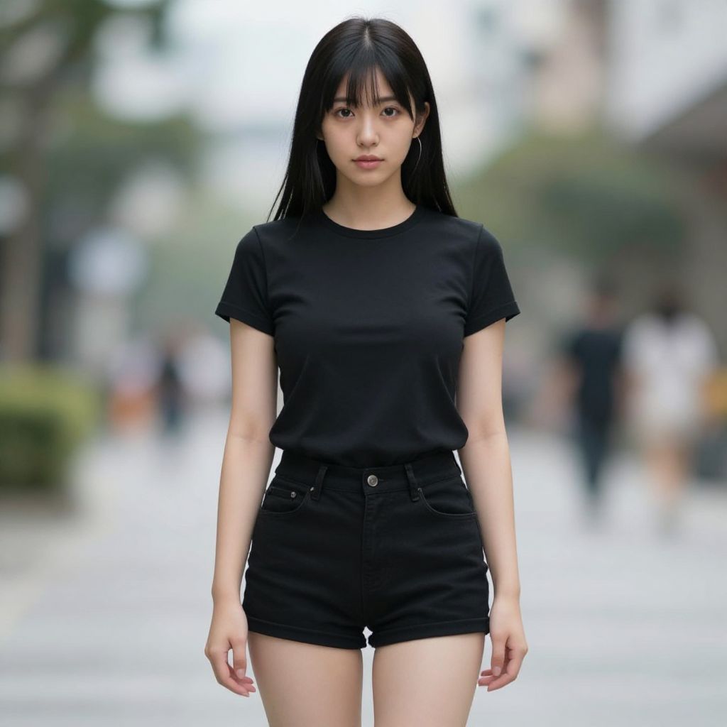 "female clothes costume, 1girl, solo, standing, full body, black hair, brown footwear, looking at viewer, shoes, long sleeves Realistic photo of casual sexy person with pretty face"