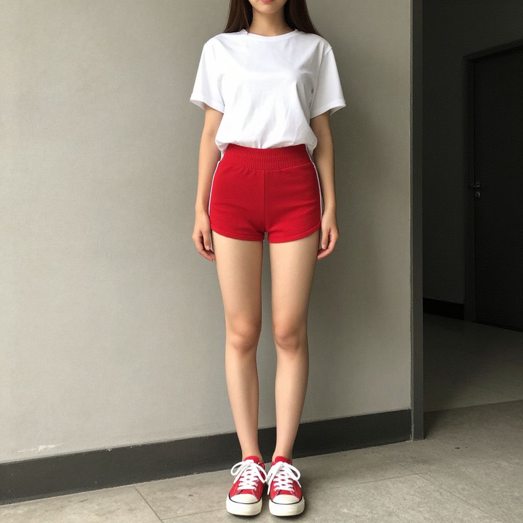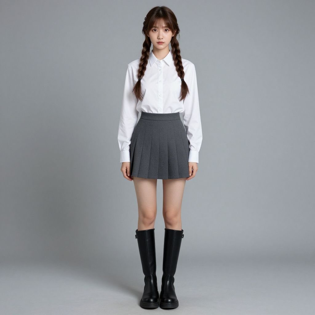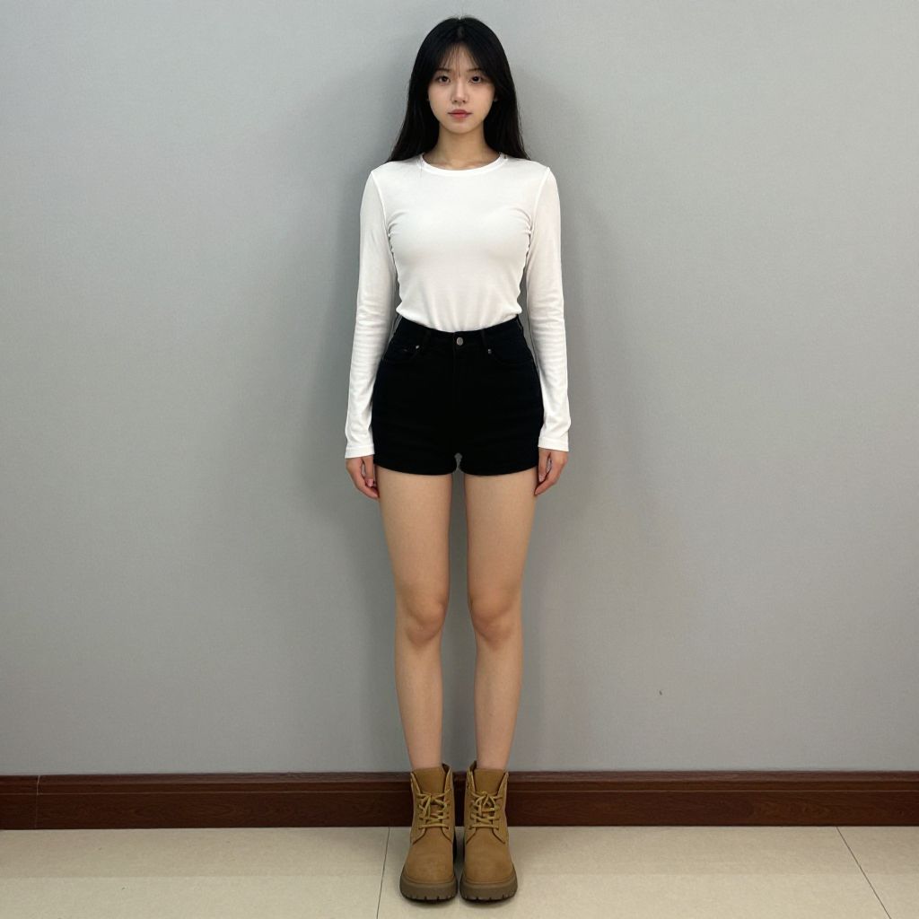 Photograph of an Asian woman standing against a plain gray wall. She has long black hair, fair skin, and wears a white long-sleeve shirt, black high-waisted shorts, and tan lace-up boots. Her expression is neutral, and she stands with her arms relaxed at her sides. The floor is tiled in a light beige color, and the baseboard is wooden. The image has a slight shadow effect, adding depth to the plain background.