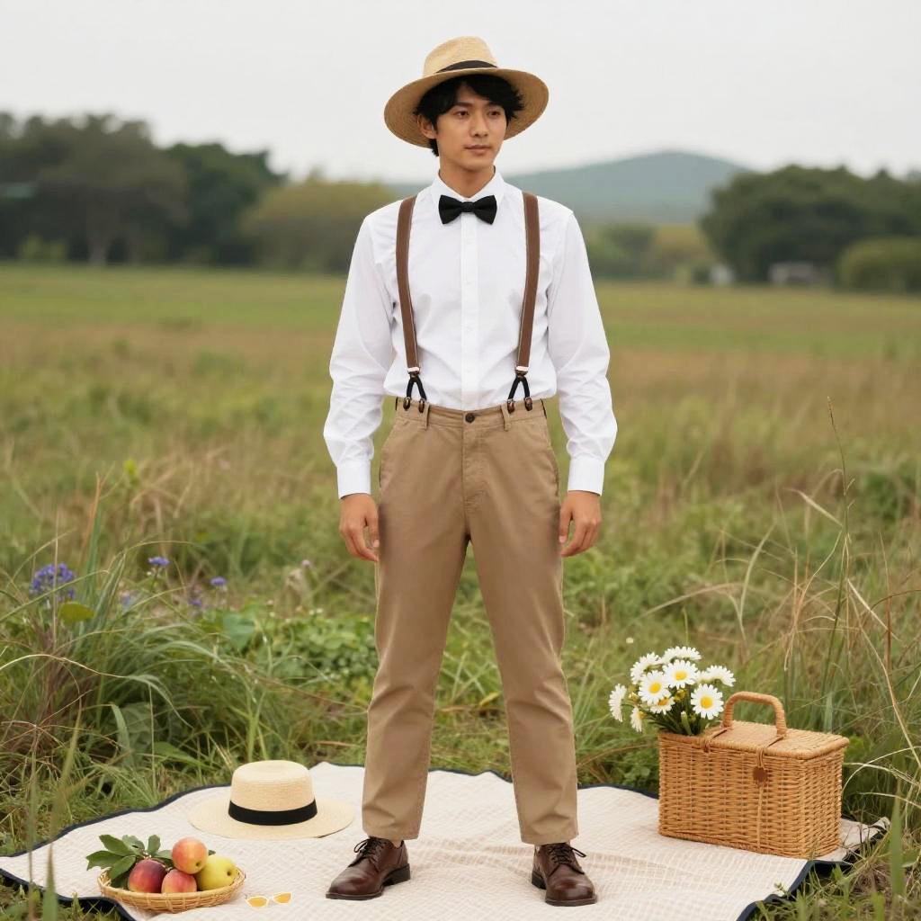 Young Asian man wearing a straw hat, white dress shirt, black bow tie, brown suspenders, khaki pants, and brown shoes, standing on a picnic blanket in a grassy field. Picnic setup includes a woven basket with white daisies and a basket with fruits, along with another straw hat and sunglasses. The background features blurred trees and hills under an overcast sky.