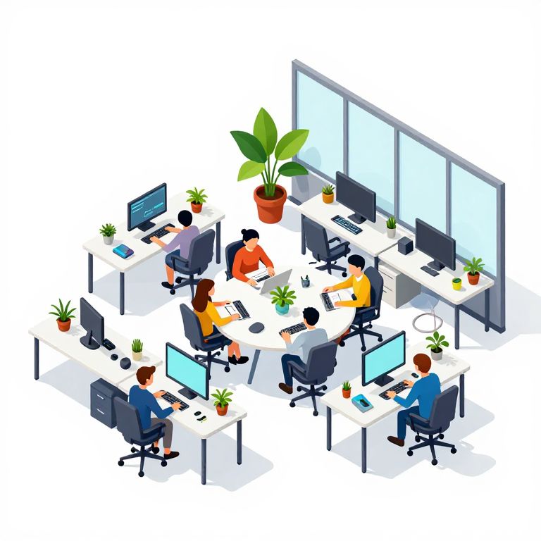 The image depicts a highly detailed, isometric illustration of a tech office team working environment set against a white background. The scene is composed of various elements meticulously arranged to convey a sense of collaboration and productivity. At the center, a round table with multiple chairs is occupied by four individuals, each engrossed in their tasks. Surrounding the table are several desks, each equipped with computers, monitors, and other office essentials. A large potted plant adds a touch of greenery to the workspace, positioned near the back wall. The office is well-lit, with natural light streaming in through large windows on the right side, casting soft shadows and highlighting the vibrant colors of the furniture and equipment. The overall composition is balanced, with objects and individuals positioned in a way that creates a dynamic yet harmonious scene, reflecting the essence of teamwork and innovation in a tech-oriented environment.