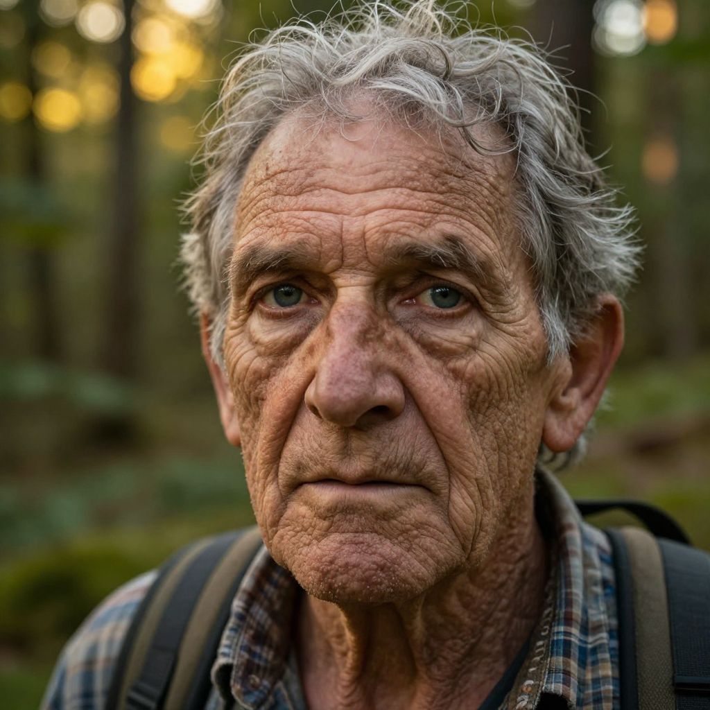 Imagine a portrait of an experienced adventurer with deep creases and furrowed skin, their melancholic blue eyes exuding wisdom and resilience. From an intimate 'bug's-eye view', the camera tenderly illuminates the rugged lines on their face, every wrinkle telling a story of a life well-lived. Framed by wild gray hair, they maintain a steadfast gaze, embodying unyielding determination that spans generations and challenges. Set against a lush forest clearing bathed in golden hour light, this close-up portrait seamlessly blends human spirit with nature's raw beauty, inviting viewers to delve into the depths of one individual's journey through life's most formidable trials.