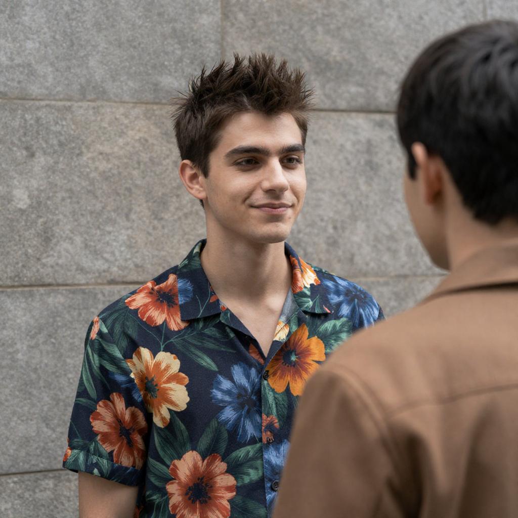 A young man with short, spiked brown hair wearing a colorful floral shirt, smiling slightly while facing another person dressed in a brown jacket. They are standing against a gray stone wall outdoors.