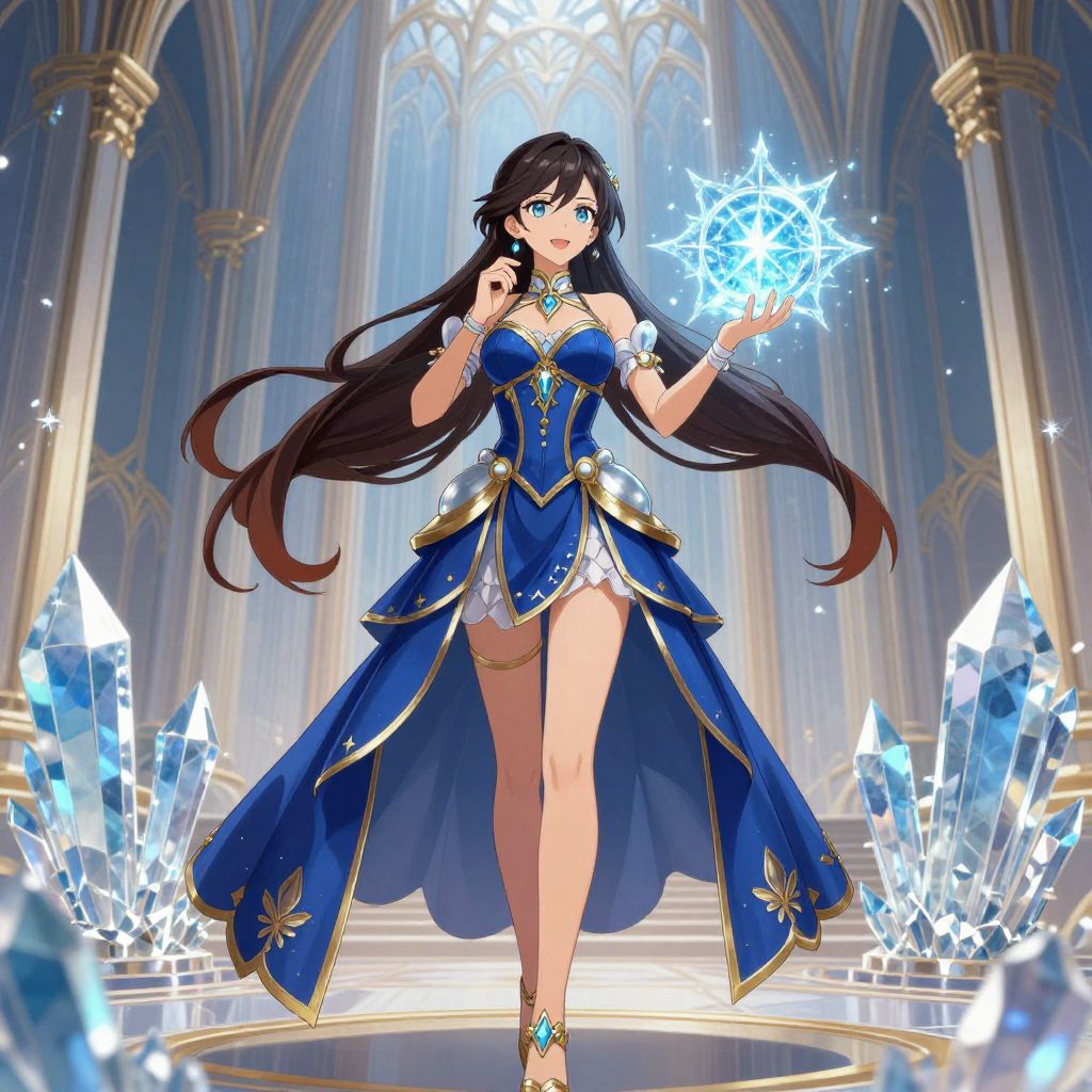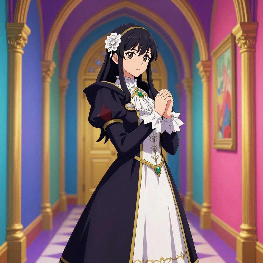 In this captivating image, a beautifully detailed character, reminiscent of a medieval noblewoman, stands gracefully in a hallway adorned with intricate arches and vibrant, neon-colored walls. Her attire, a sophisticated combination of a dark coat and a white dress, is accentuated by a delicate flower accessory in her hair, adding a touch of elegance and grace. The character's pose, with hands clasped together, exudes a sense of poise and refinement. The background features a striking golden ratio composition, with elements like a door and a painting subtly blending into the scene, creating a sense of depth and dimensionality. The overall color palette is rich and varied, with neon hues and metallic tones interplaying to create a visually striking and immersive atmosphere. The image is a testament to the intricate artistry of manga and anime styles, with meticulous attention to detail in the character design, clothing, and background elements.