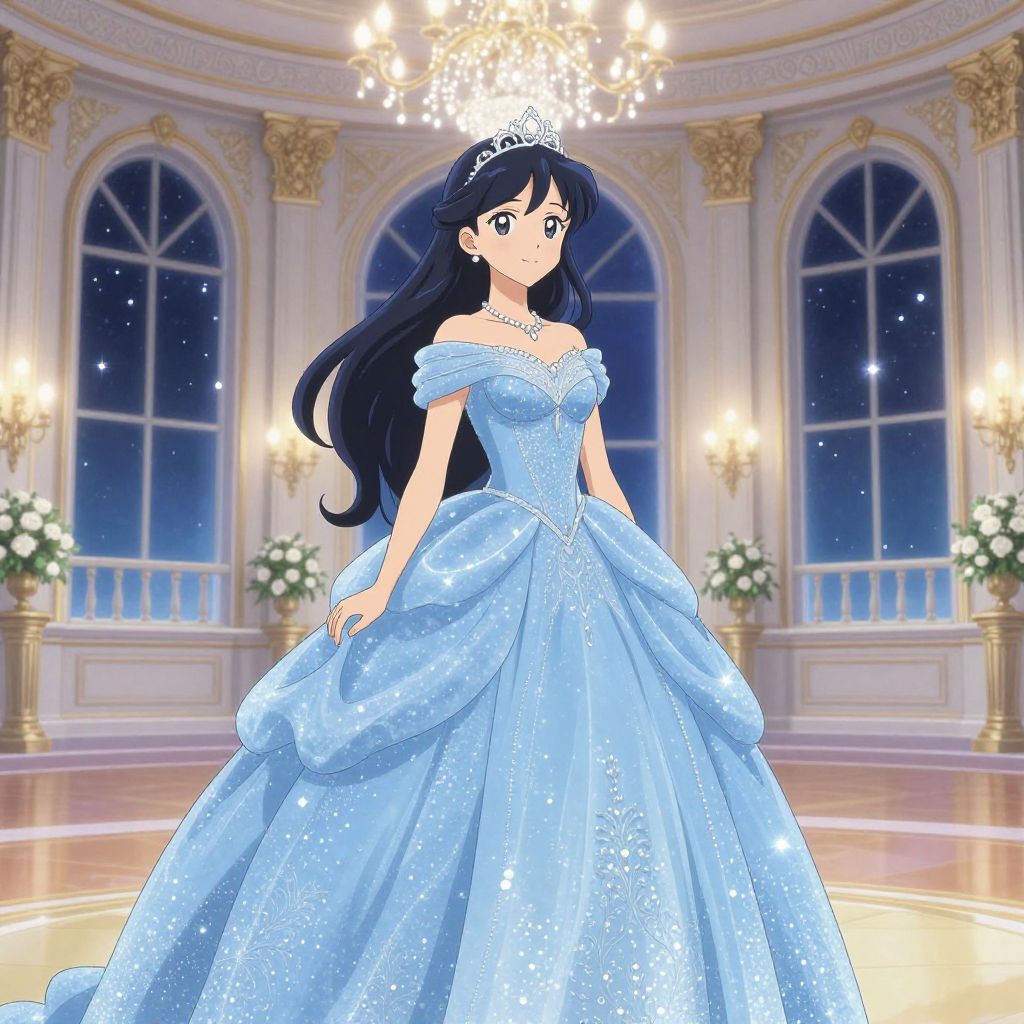 Anime-style drawing of a black-haired girl in a white and black gothic dress with a flower in her hair, standing in a colorful, arched