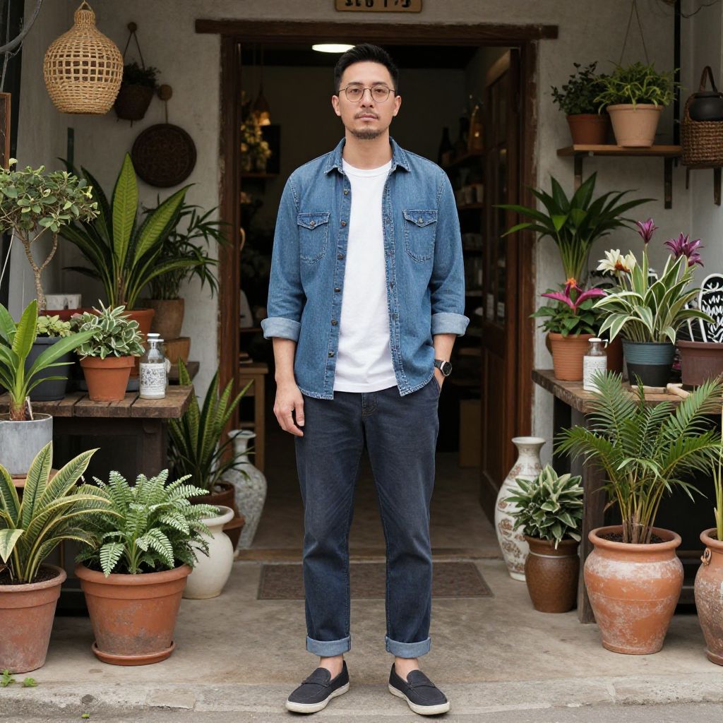 An artistic image featuring a man standing confidently in front of a rustic shop with plants and pottery, exuding a casual yet stylish vibe with his outfit.