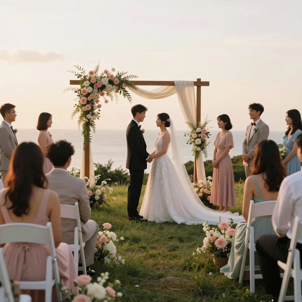 Wedding prompts featuring a romantic outdoor ceremony at sunset, elegant decorations, soft pastel colors, guests in formal attire, delicate flower arrangements, capturing the intimate, joyful ambiance with a dreamy, cinematic style
