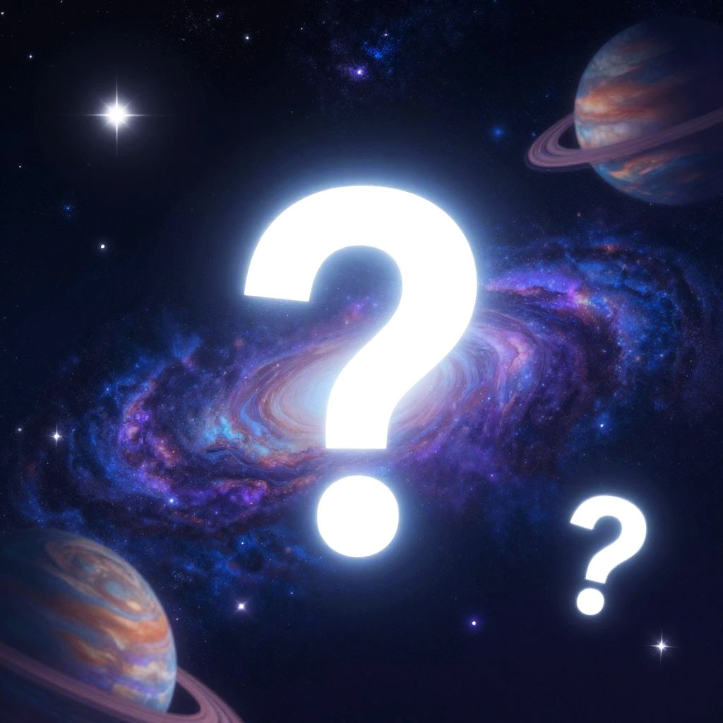 Trivia background showcasing a cosmic galaxy theme with sparkling stars, planets, and floating question marks, deep blue and purple hues for an intriguing and mysterious vibe