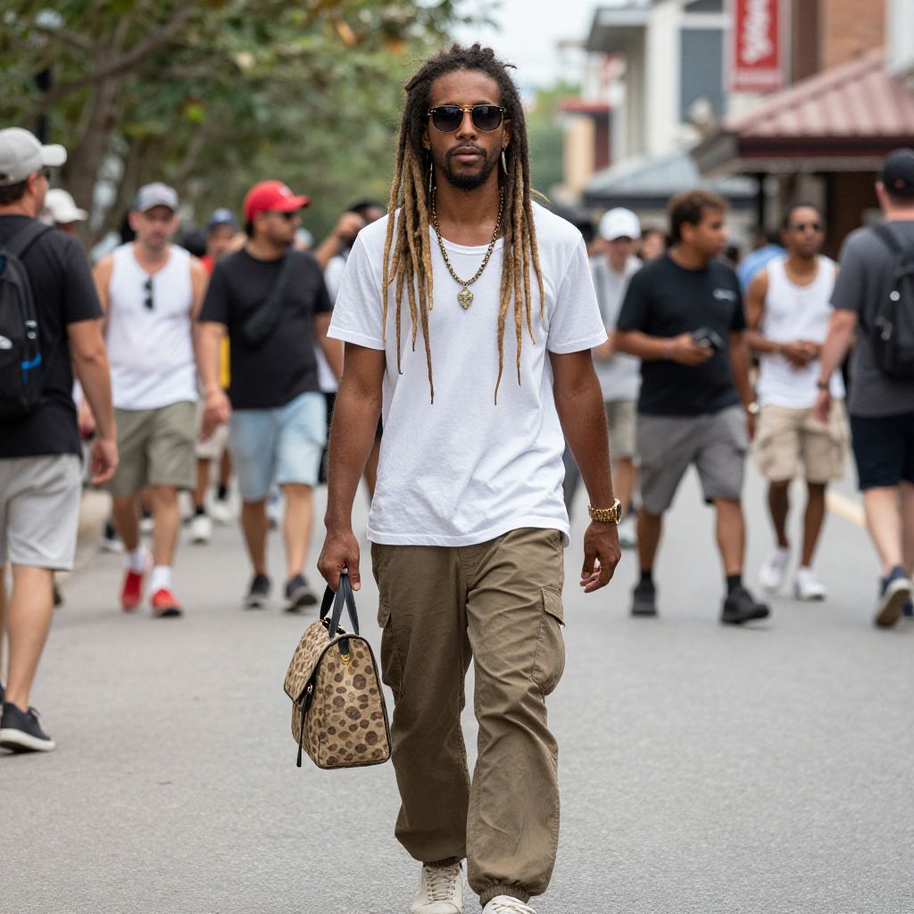 "Woodstock Party, man with dreadlocks and sunglasses walking down the street"