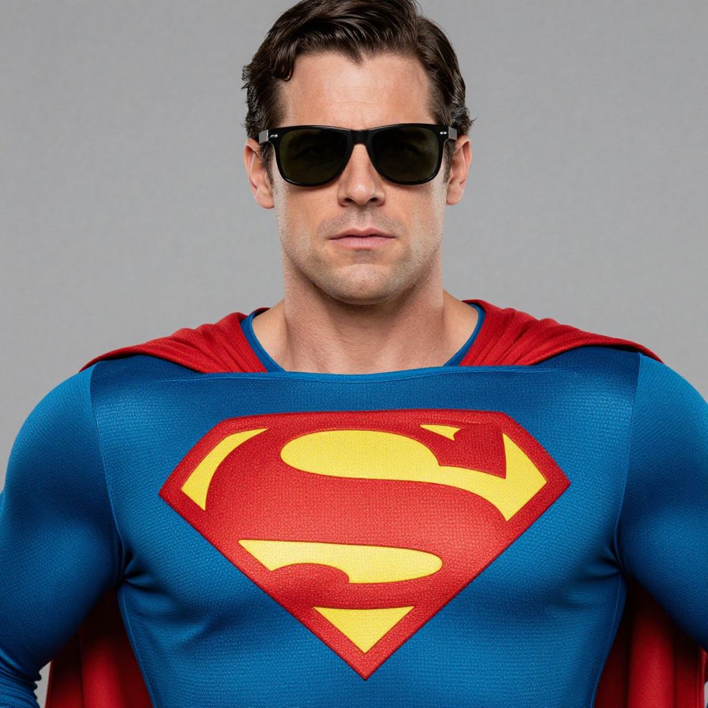 Super Heroes Clothes Costume, a close up of a man in a superman costume with sunglasses