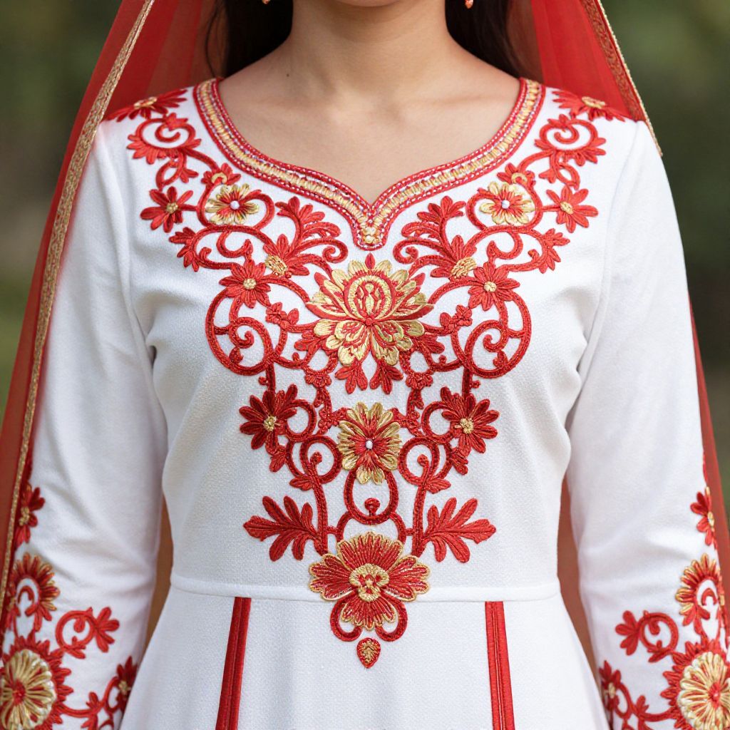 "Traditional Embroidered Wedding Dress, a close up of a woman wearing a white and red dress"