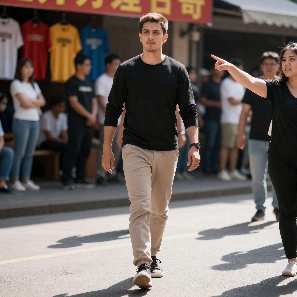 Photograph of a street performance. A man with short brown hair, wearing a black long-sleeve shirt and beige pants, walks forward with a determined expression. To his right, a woman with dark hair, wearing a black top, points enthusiastically. Background includes a crowd, colorful banners, and a shop with hanging shirts. Bright sunlight casts strong shadows.