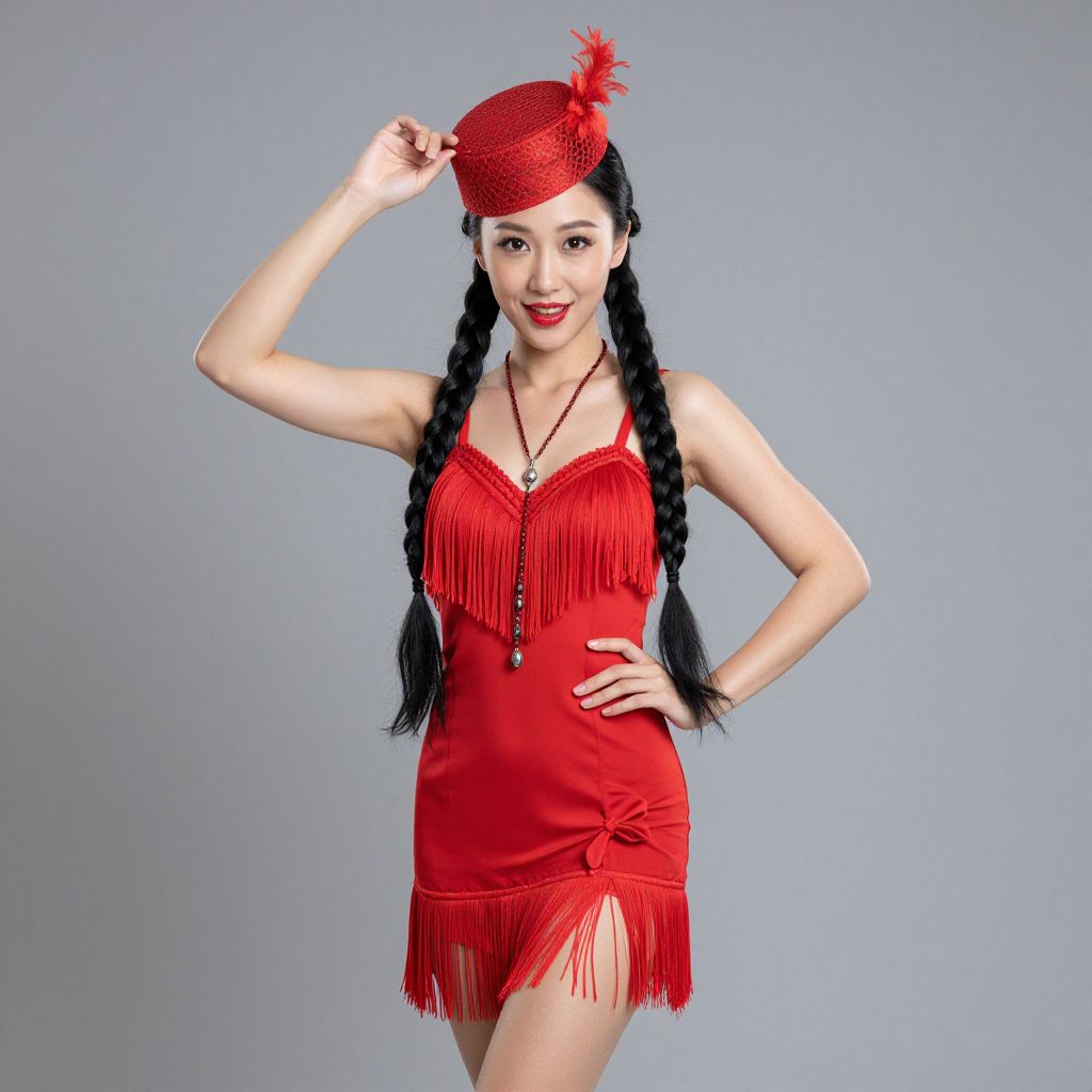 Photograph of an Asian woman with long black braids, wearing a red, fringe-trimmed, sleeveless dress that ends mid-thigh, and a matching red hat with a small feather. She has fair skin, red lipstick, and a necklace with a black cord. She stands against a plain gray background, smiling and holding her hat with her right hand, while her left hand rests on her hip. The dress has a bow on the right side and fringed hemlines. The overall style is vintage-inspired with a playful, flapper-like vibe.