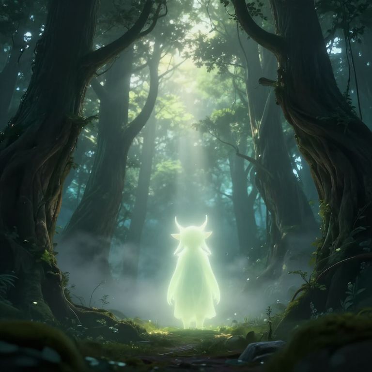 Lutus, a mystical forest creature, shrouded in ethereal glowing mist, surrounded by ancient towering trees with twisting branches, soft beams of sunlight piercing the canopy, a serene and magical atmosphere, fantasy art style.