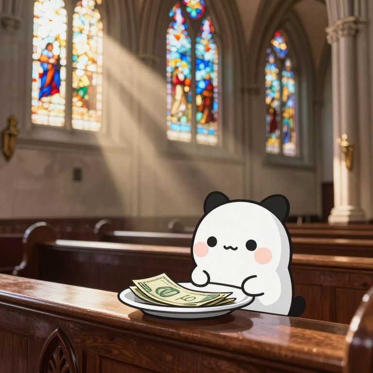 A high definition image of a church interior with sunshine streaming through colorful stained glass windows. A cute kawaii-style cartoon character resembling a small animal sits on a wooden pew next to an offering plate containing money bills. The scene combines a serene religious setting with a playful animated figure.