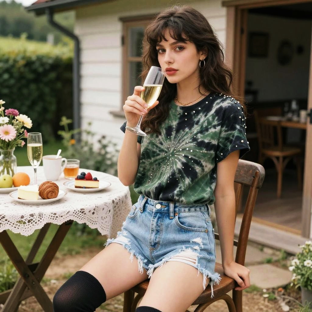 Athletic woman in a casual grunge style, wearing a dark green and black tie-dye T-shirt with studded embellishments, paired with light-wash distressed denim shorts and over-the-knee black socks, enjoying a Champagne Morning Feast in a Countryside Cottage, shogakukan visual style. Sexy. Pretty face and beutiful eyes