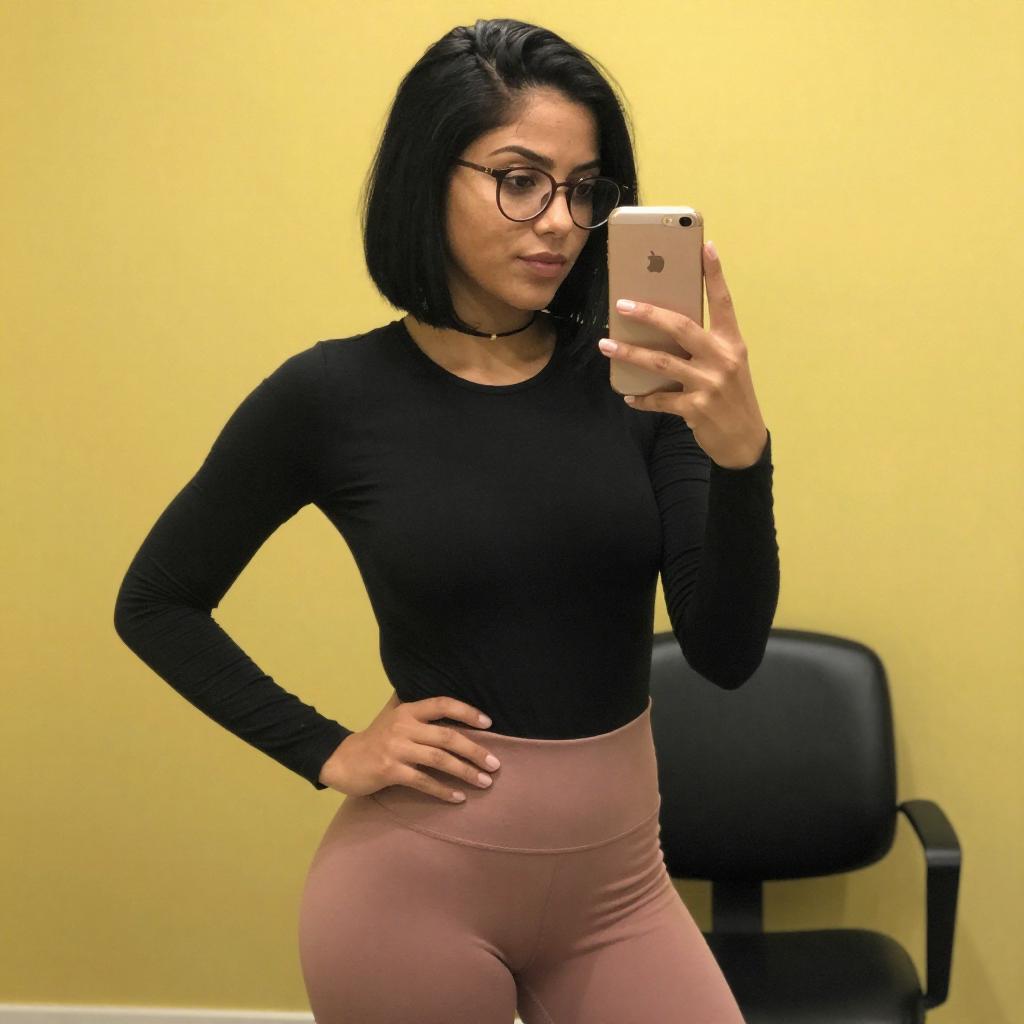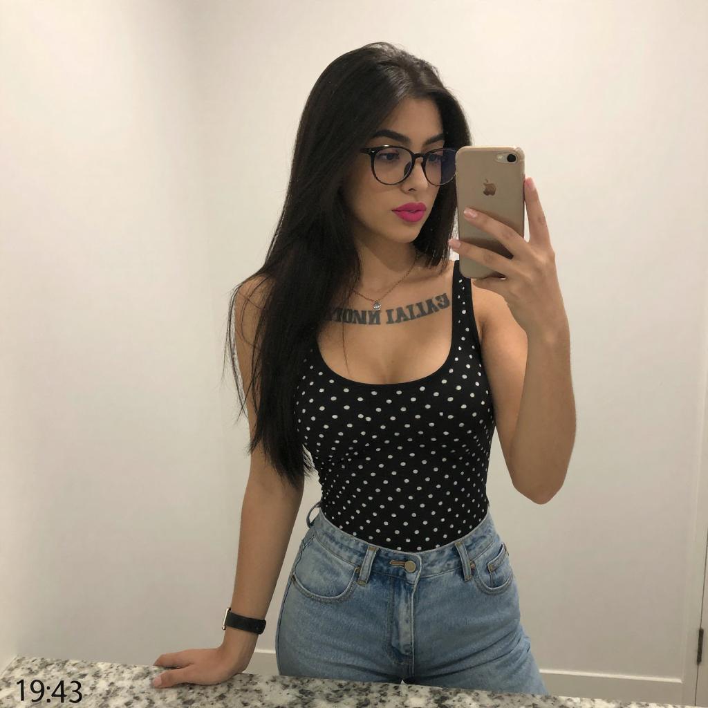 A young woman with long dark hair, glasses, and pink lipstick takes a mirror selfie. She wears a black polka dot tank top with a low neckline, revealing a tattoo across her chest, and light blue jeans. She holds a smartphone in her right hand, standing in a white-walled room with a granite countertop in the foreground.