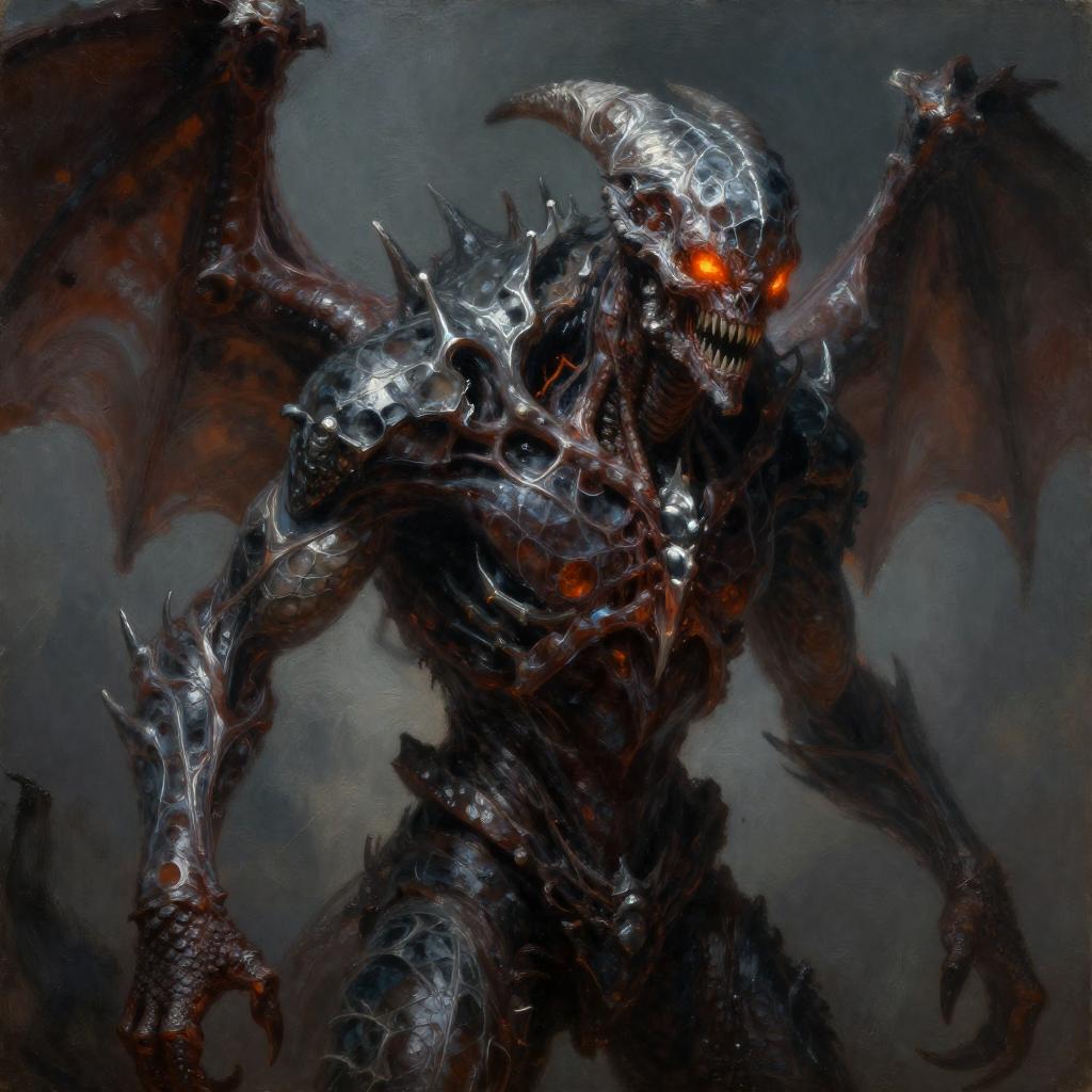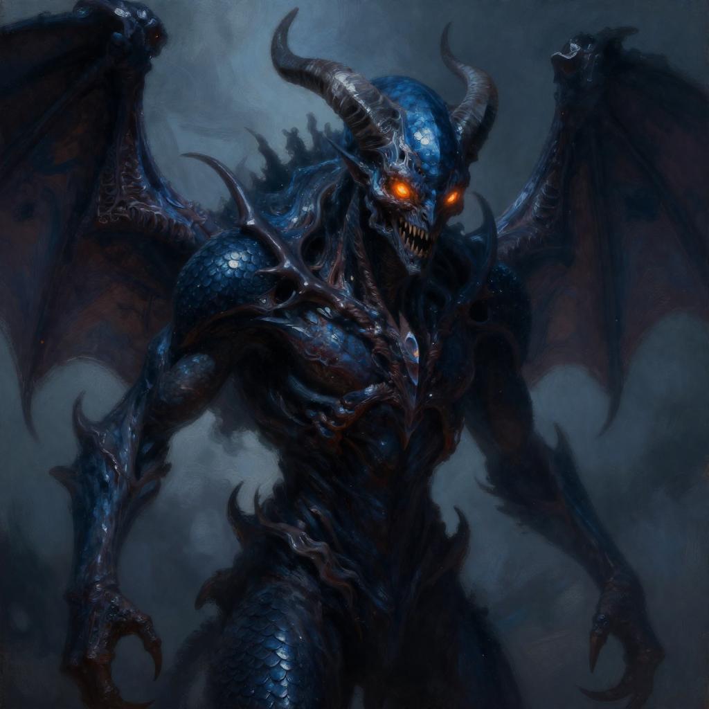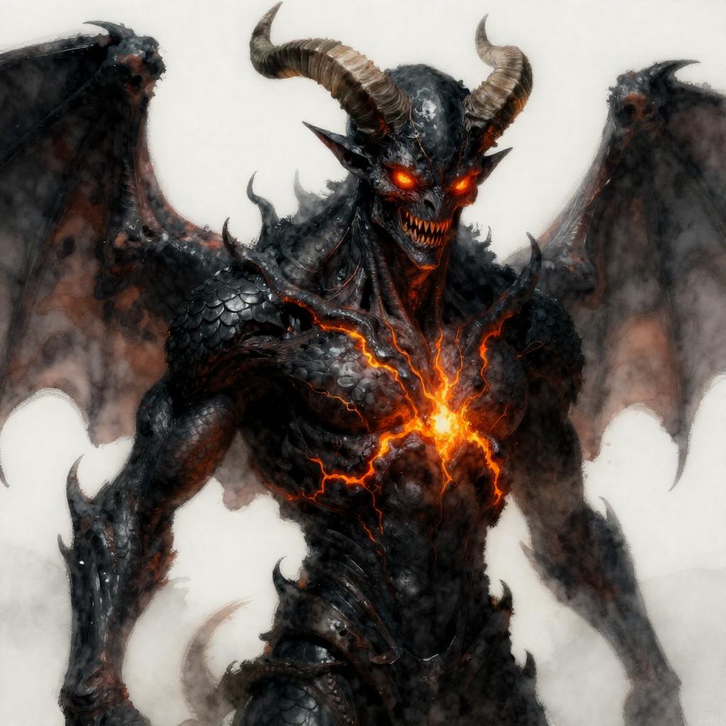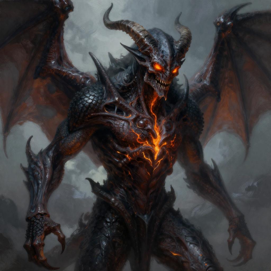 Draw an Orc with brown skin with an original appearance, but with distorted and sinister details. Its features should evoke the darkness and chaos of the Abyss: flaming eyes, twisted claws, dark skin with scales, and perhaps even membranous wings or curved horns. The image should be in Digital Art style with a quality similar to oil pastel, characterized by strong contrasts between light and shadow. The textures should give an impression of depth and richness, akin to those of a traditional painting.