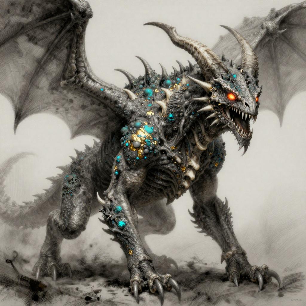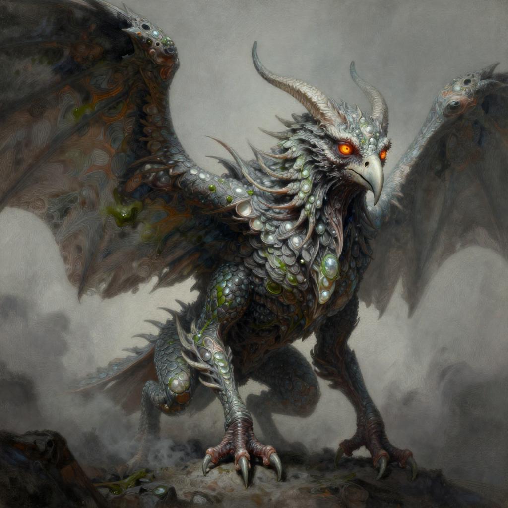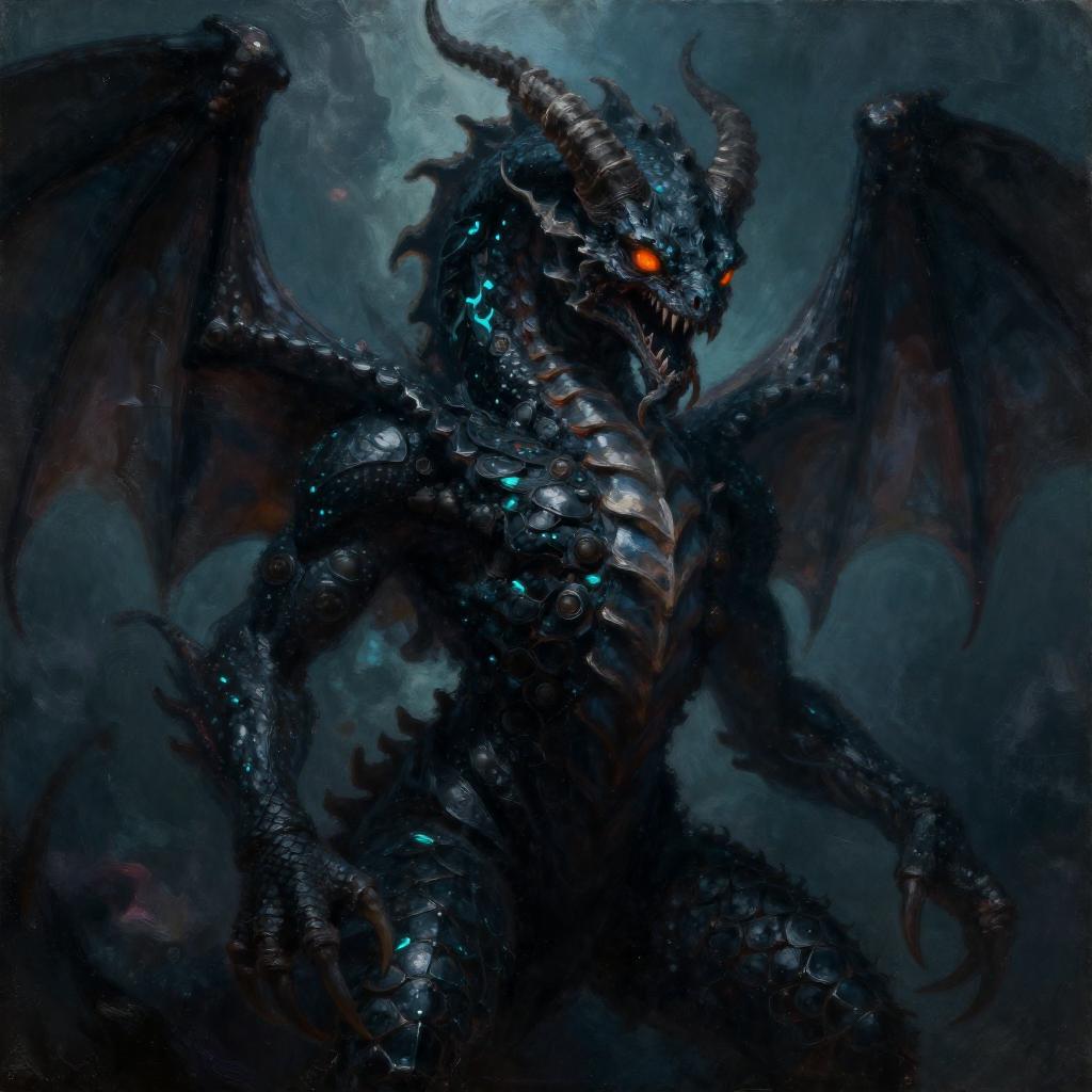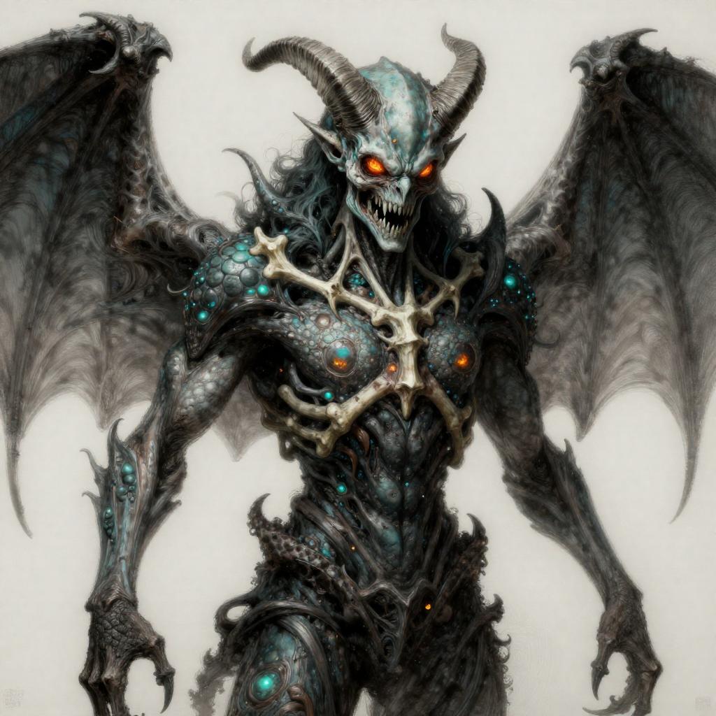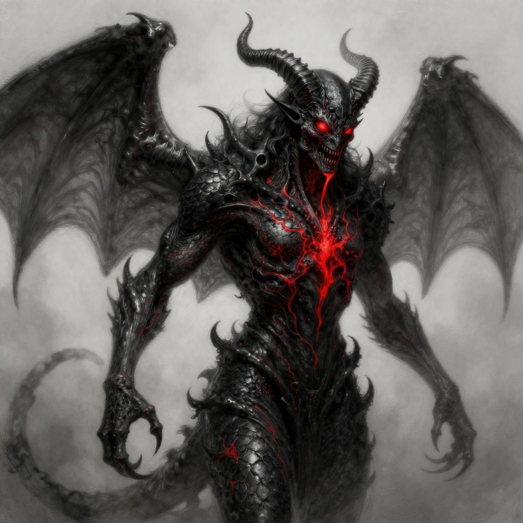 Draw an Orc with brown skin with an original appearance, but with distorted and sinister details. Its features should evoke the darkness and chaos of the Abyss: flaming eyes, twisted claws, dark skin with scales, and perhaps even membranous wings or curved horns. The image should be in Digital Art style with a quality similar to oil pastel, characterized by strong contrasts between light and shadow. The textures should give an impression of depth and richness, akin to those of a traditional painting.