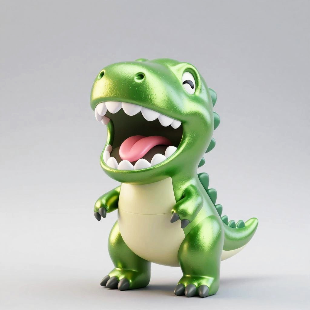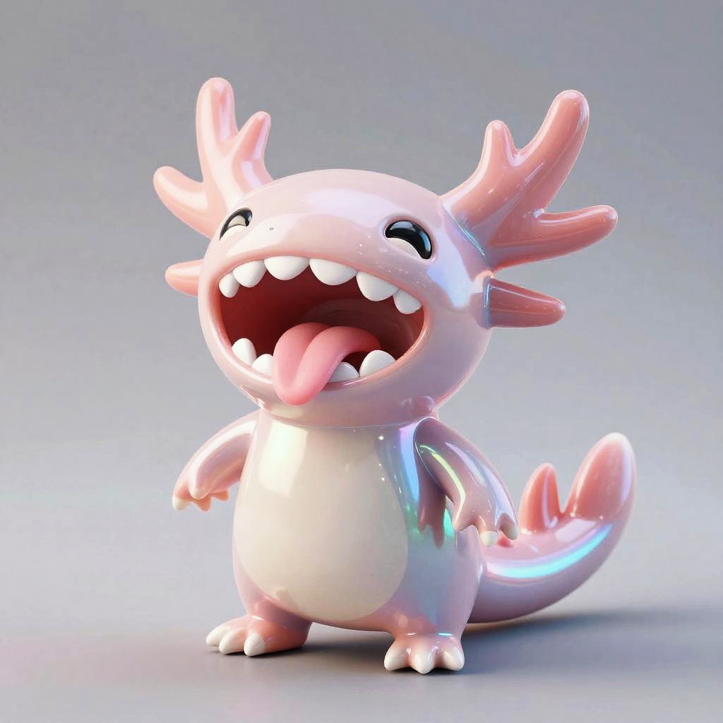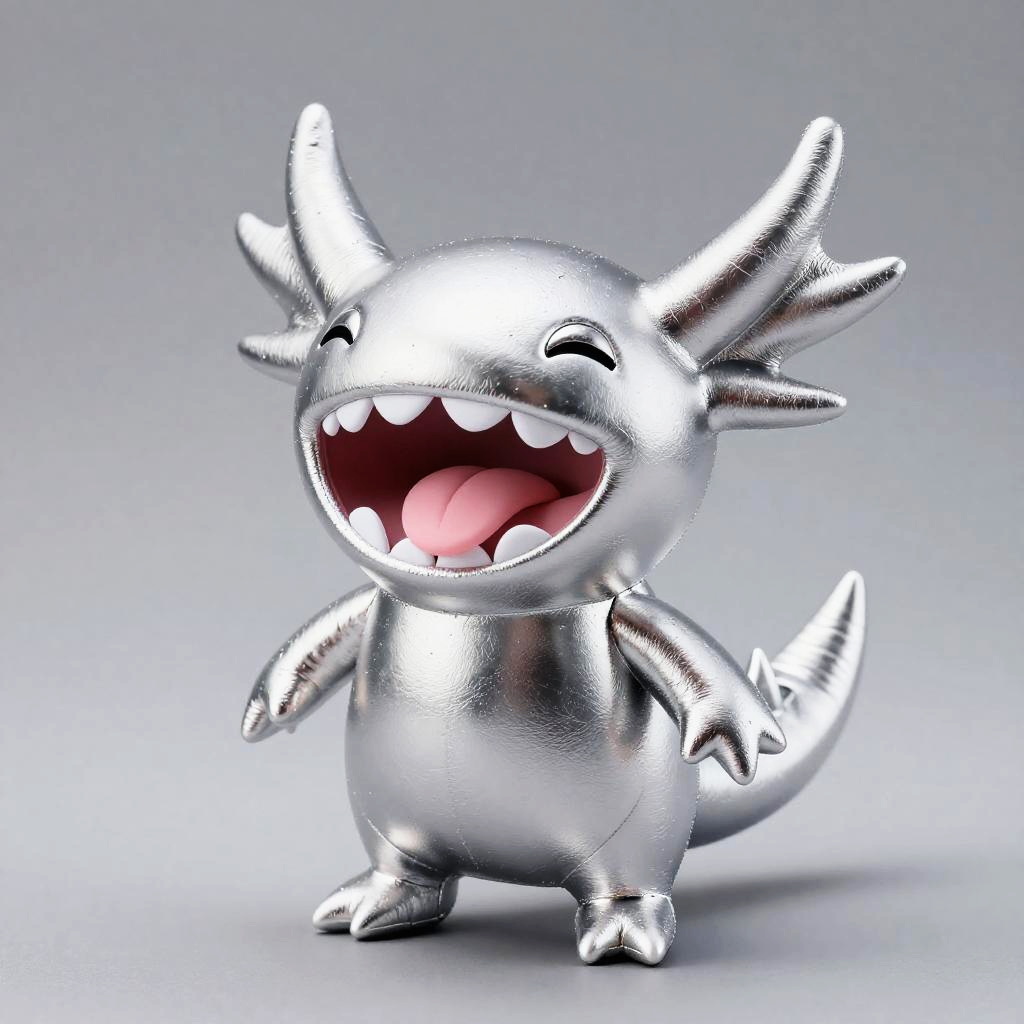 A shiny, metallic gold plushie Tiger with a cute, chubby body and a wide-open mouth filled with white, rounded teeth and a pink tongue. Its eyes are small and slightly closed, and it has a small fin-like structure on its back. The background is a simple, gradient gray, highlighting the creature's glossy texture and vibrant color. The overall style is whimsical and playful.
