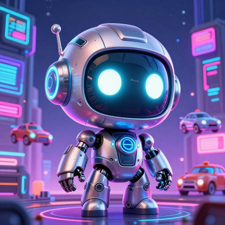 A vibrant, digital CGI image of a cute, chibi-style, silver robotic figure with a large, black, glowing screen face and two bright white eyes. It has a rounded helmet with an antenna and blue circular accents on its shoulders and chest. The background is a futuristic cityscape with neon pink, blue, and purple lights on towering buildings, and floating, retro-style cars. The robotic figure stands on a glowing purple circular platform, adding a futuristic vibe. The overall aesthetic is cyberpunk with a playful, cartoonish touch.
