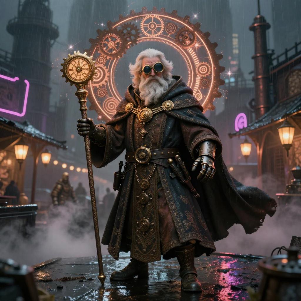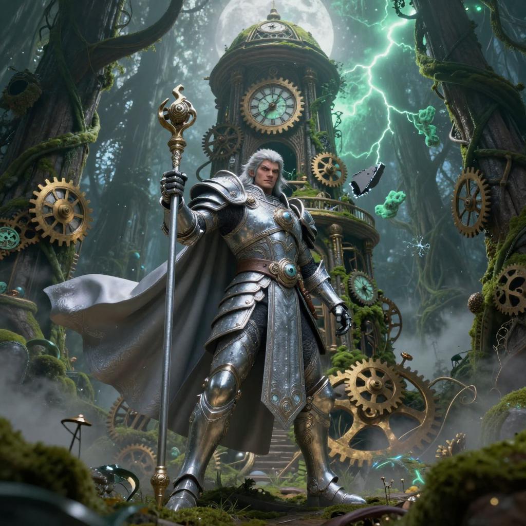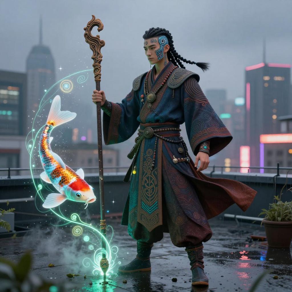 Full body, masterpiece, best quality, 3d, realistic, hdr, photoreal, stoic cybernetic monk, in bioluminescent mangrove ruins beneath a swollen blood-red moon, fog-laced water channels, hanging lanterns and twisted root-arches, casting a swirling vortex of ethereal blue flames, whimsical particles and tasteful sparkle, ornate robes and staff, wind-whipped cape, cinematic rim light, volumetric fog, subsurface scattering, ray-traced reflections, PBR materials, dynamic pose, ultra-detailed fabrics and skin, crisp focus, shallow depth of field, 85mm lens, filmic color grading, high contrast, moody atmosphere, natural color science, subtle film grain