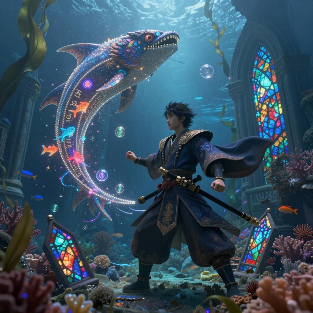 Stoic Cybernetic Monk in Bioluminescent Mangroves