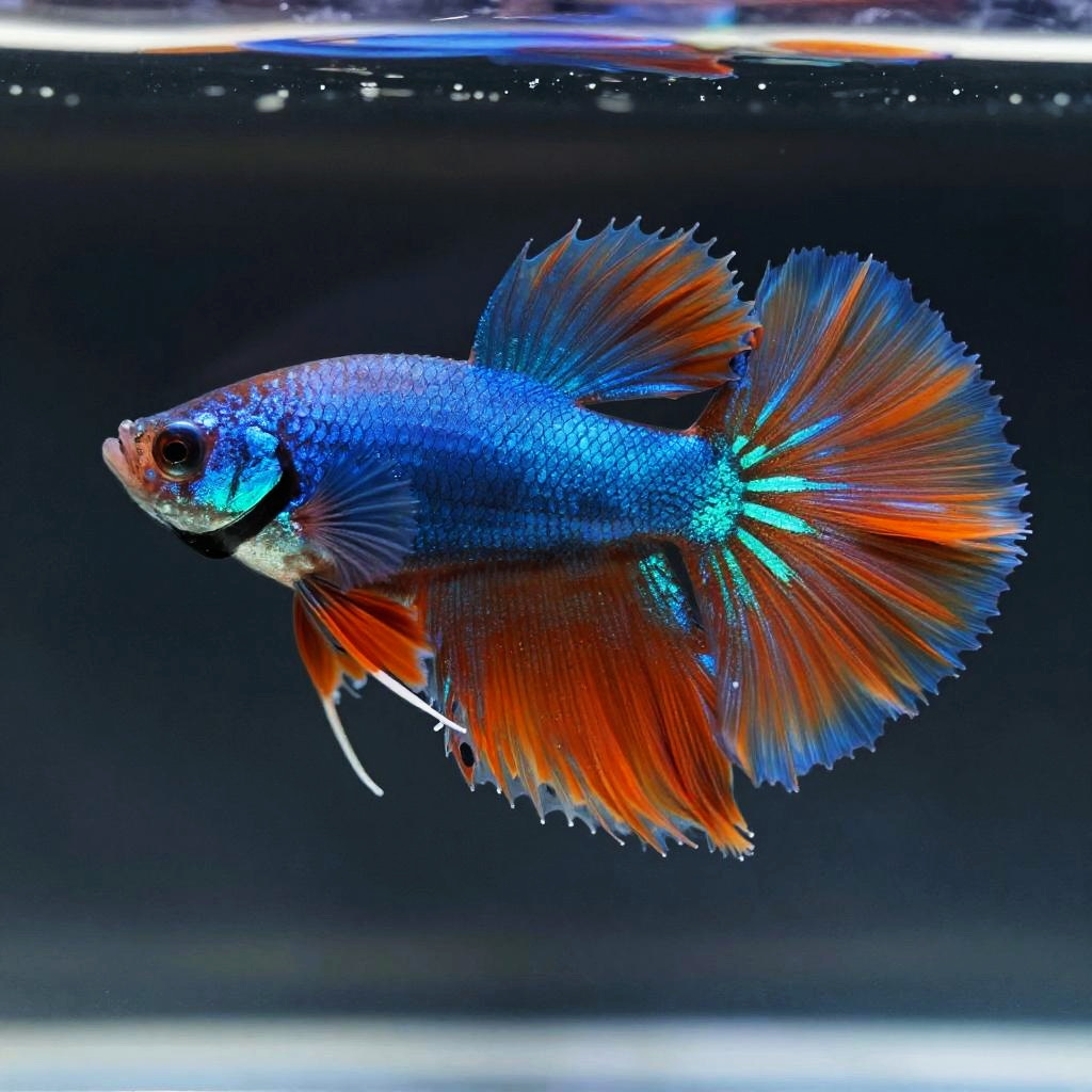 A vivid photograph of a neon tetra fish in a clear aquarium. The fish has a bright blue, speckled body with iridescent turquoise highlights on its head and fins. Its large, flowing fins are a striking red-orange with subtle blue and green accents. The background is a dark, gradient black, emphasizing the fish's vibrant colors. The water's surface reflects light, creating a subtle white line at the top of the image. The fish's delicate, translucent fins and sharp, dark eyes add to its ethereal appearance.