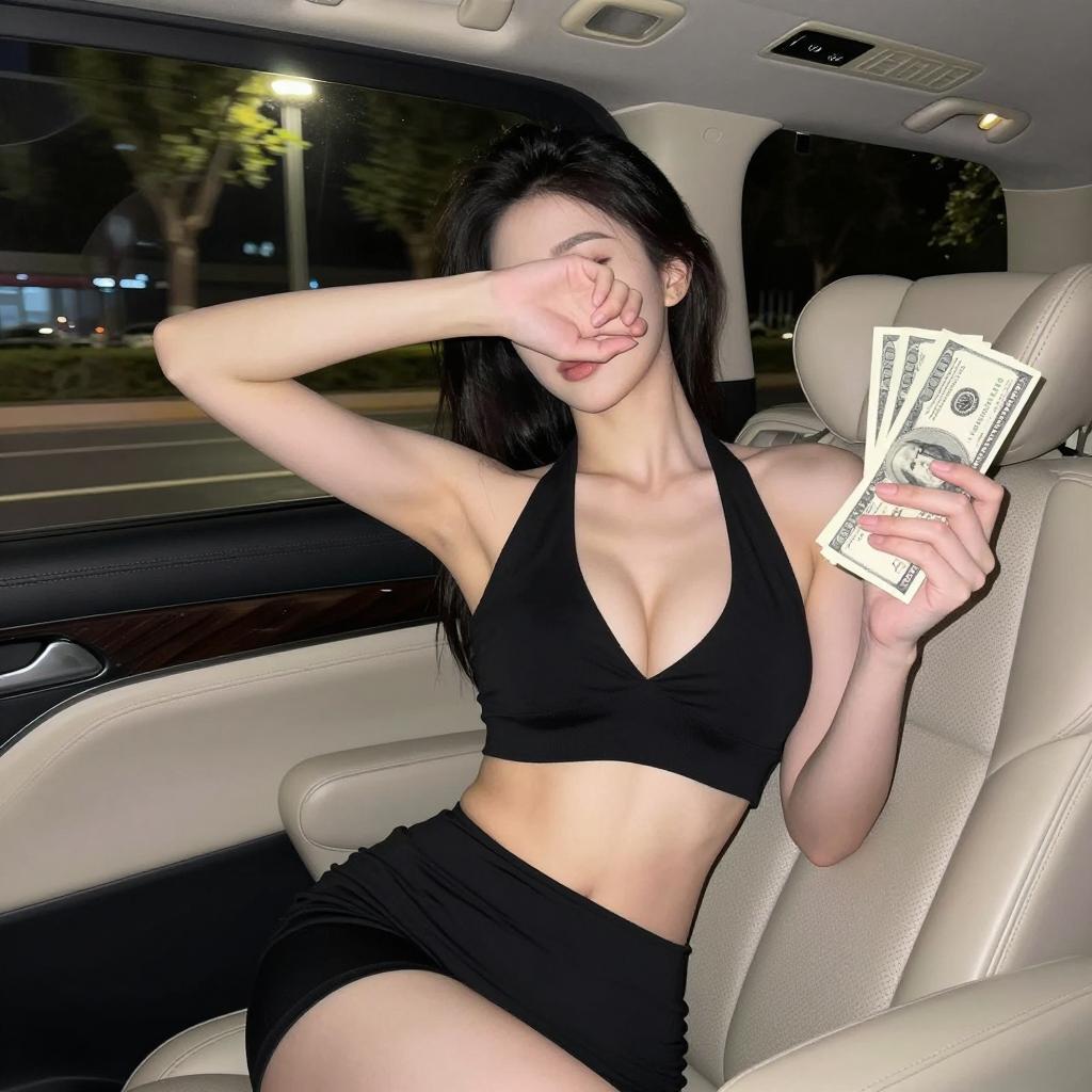 Photograph of an Asian woman with long black hair sitting in a car at night. She wears a black, deep-cut halter top and a short black skirt, revealing her small to medium-sized breasts and flat stomach. Her right arm is raised, hand in hair. She holds a wad of $100 bills in her left hand. The car interior is beige, with a window showing a streetlight and trees outside. Her face is mostly obscured by her arm.