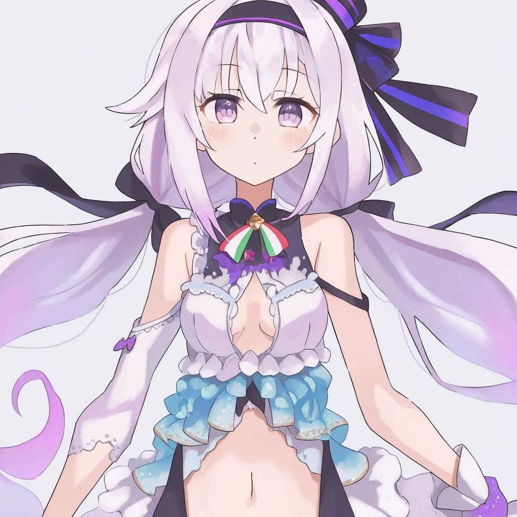 Carro pino, .live, 1girl, purple eyes, hair between eyes, purple hair, long hair, low twintails, small breasts, navel, virtual youtuber, virtual youtuber, headband, by artist sugue tettou, leet