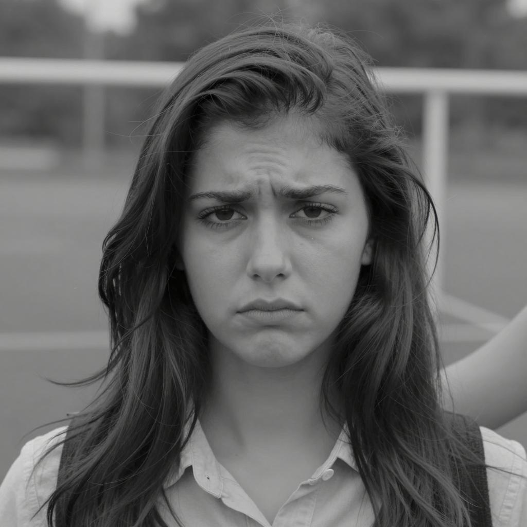 A young woman with long, dark hair, slightly windswept, wearing a collared shirt. She has a worried expression, furrowed brows, and downturned eyes. Background includes a blurred fence and outdoor setting. Her face is centered, taking up most of the frame. One visible arm is partially visible on the right.