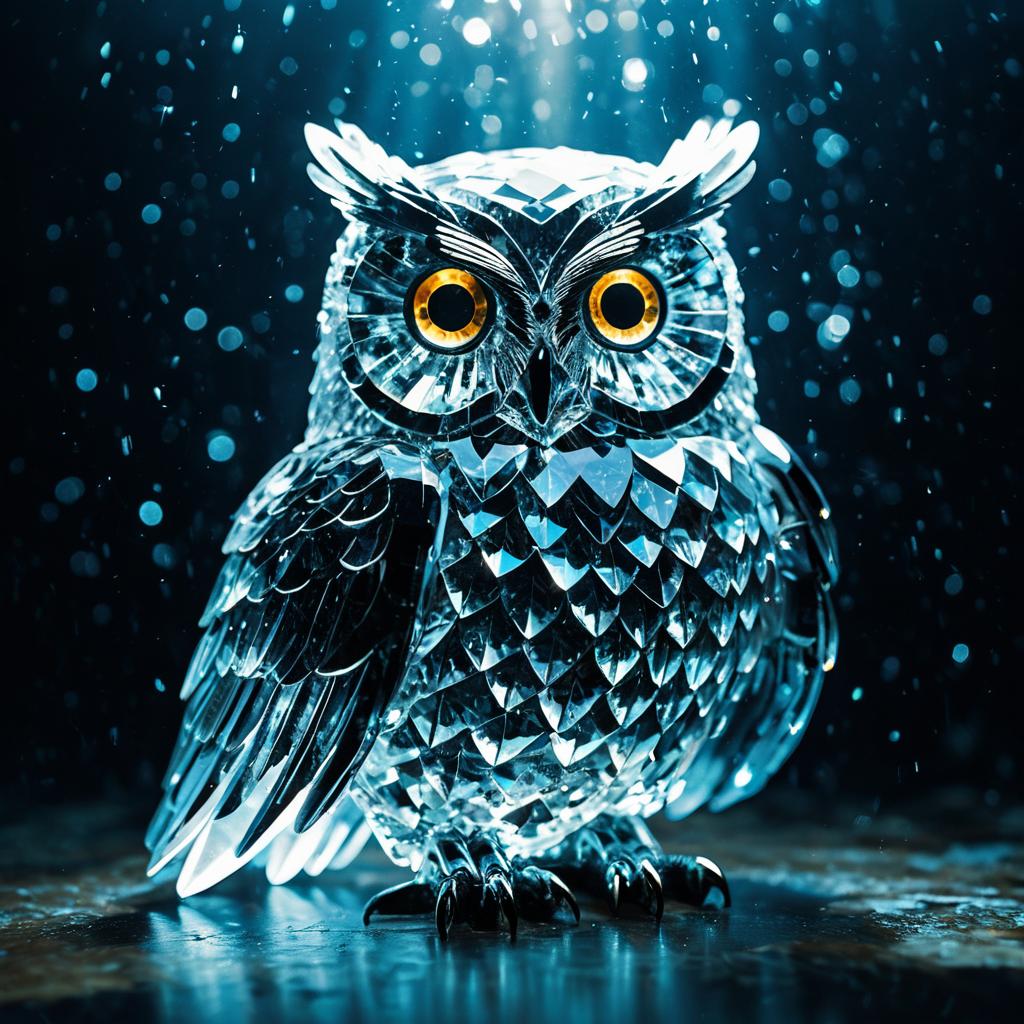 Detailed close-up of a crystallized glass owl sculpture with large glowing amber eyes, illuminated by cinematic lighting and surrounded by water droplets. The owl's intricately faceted glass feathers reflect underwater light effects, giving a majestic and mystical ambiance.