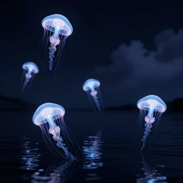 Glowing translucent jellyfish float serenely across a dark, starlit sky, their ethereal bioluminescence illuminating the surrounding clouds and reflecting off the calm waters below, creating a mesmerizing nocturnal scene.