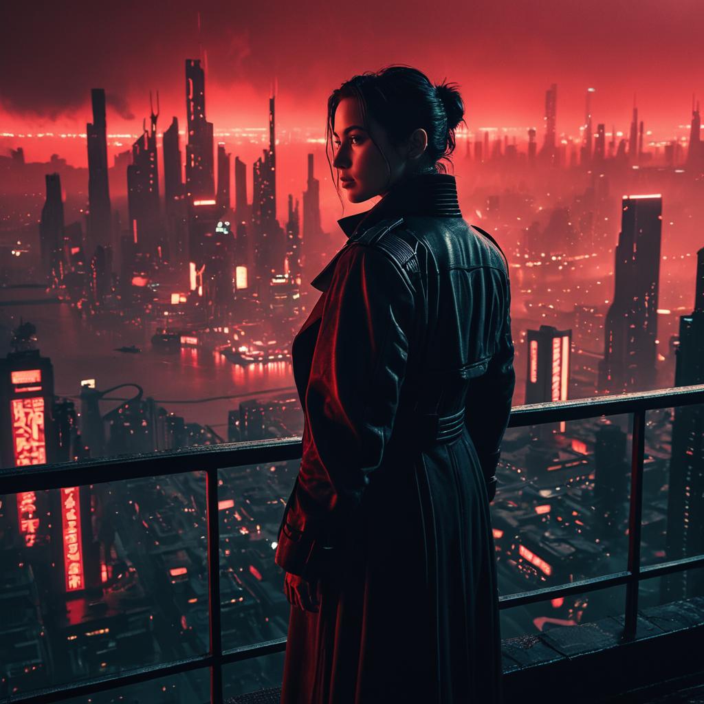 Photorealistic image of an Asian woman with dark hair tied in a bun, dressed in a long black leather coat, standing on a balcony overlooking a sprawling futuristic city. The city features tall skyscrapers with vibrant red neon lights and illuminated signs, set in a moody, red-tinted dusk atmosphere with light fog and volumetric lighting effects.