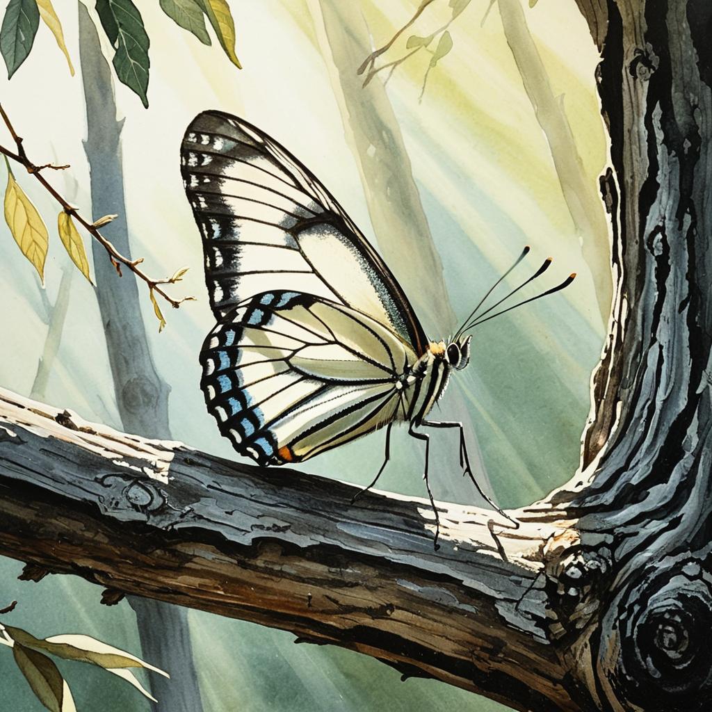 Detailed watercolor painting of a delicate butterfly resting on an ancient tree branch. The butterfly features smooth wing veins with black, white, and subtle blue and orange markings. Dappled sunlight filters through surrounding leaves and trees, creating a tranquil and soft natural atmosphere.