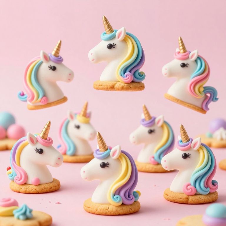 Pastel-hued unicorn heads emerge from golden cookies, their whimsical manes of rainbow frosting defying gravity as they swirl and dance in a dreamlike tableau of magical confectionery.