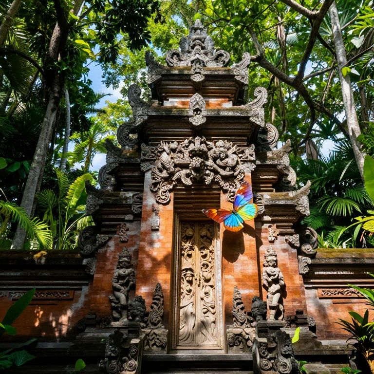 Photograph of an ornate, ancient Balinese temple with intricate stone carvings, vibrant butterfly-shaped decoration, and lush green forest background.