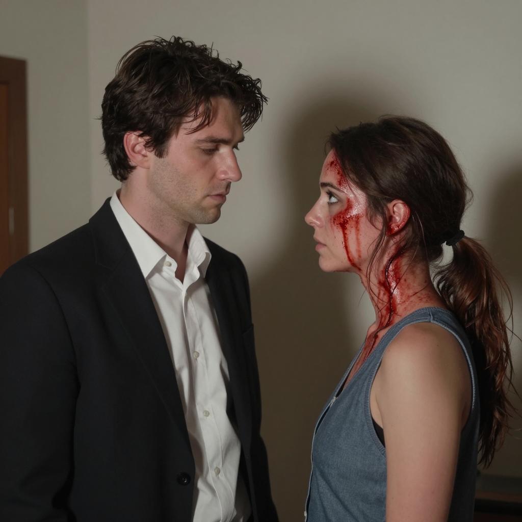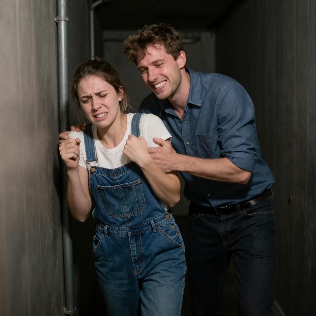 A young couple in a narrow, dimly lit corridor with vertical wooden panel walls. A man wearing a blue long-sleeve shirt and dark pants is forcefully pulling a distressed woman in denim overalls and a white t-shirt. The woman shows expressions of pain and discomfort, leaning against a metal pipe. The man's grip on her arms suggests aggression or coercion.