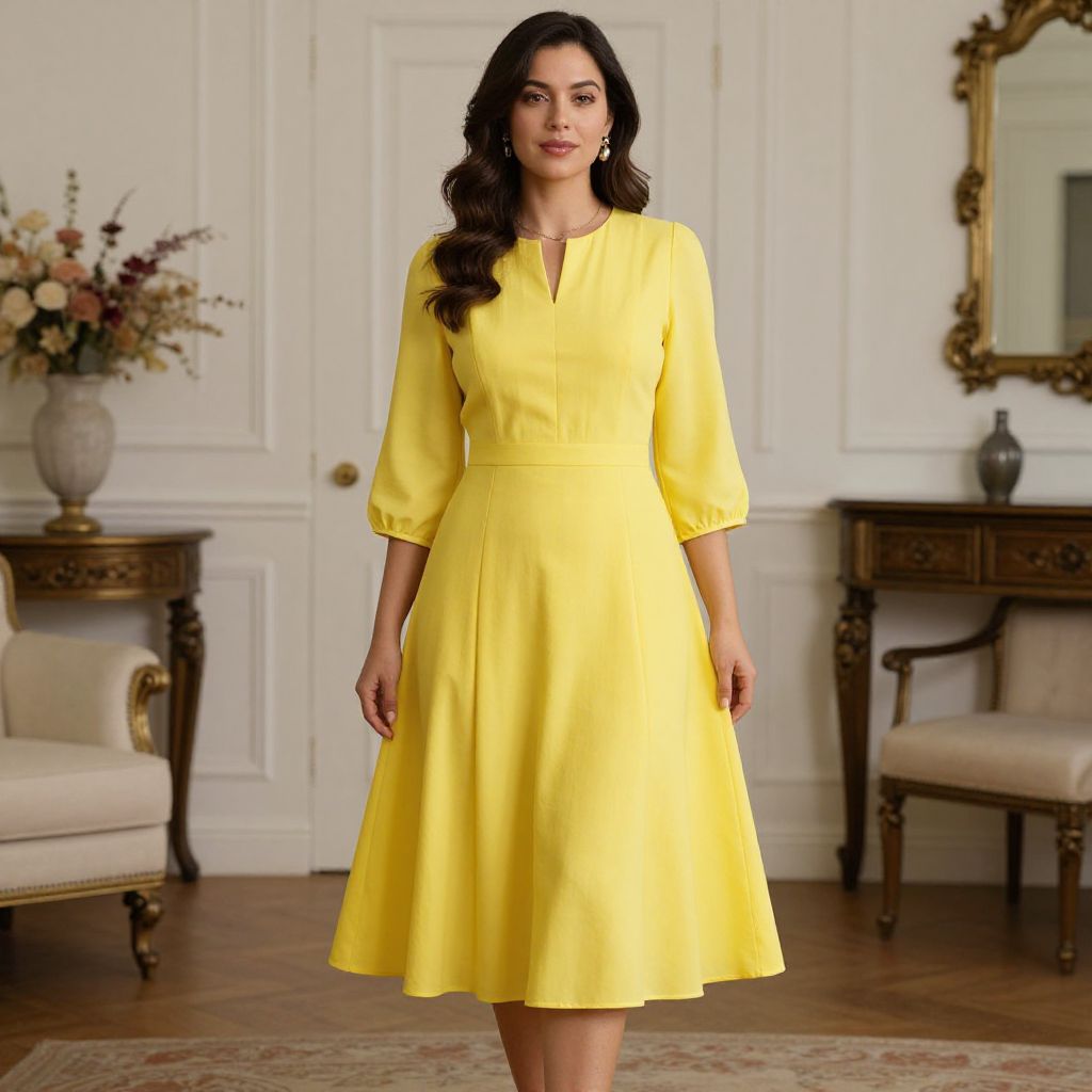Photograph of a woman with long, wavy black hair standing in an elegant, well-lit room. She wears a bright yellow, knee-length, long-sleeved dress with a V-neckline. Her skin is medium brown, and she has a confident expression. The room features white paneled walls, a wooden console table with a vase of flowers, and an ornate gold-framed mirror. An upholstered chair with a wooden frame is to her left. The wooden floor is partially covered by a patterned rug. The overall style is classic and sophisticated.
