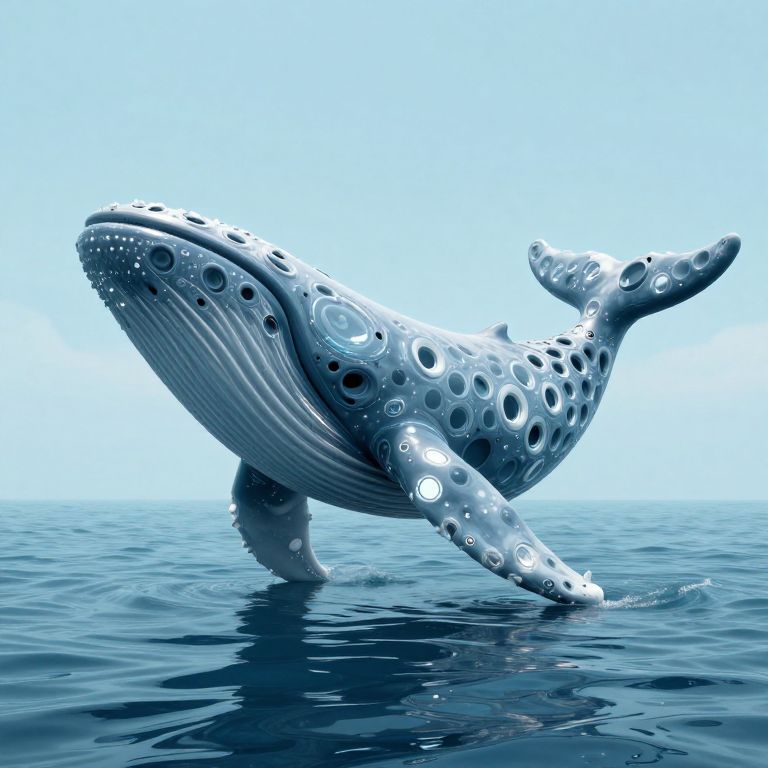 A futuristic 3D-rendered structure emerges from the ocean, featuring a sleek, organic design with numerous circular openings resembling a whale's baleen, symbolizing a harmonious blend of architecture and marine life, crafted to resonate with dream frequencies across the seas.