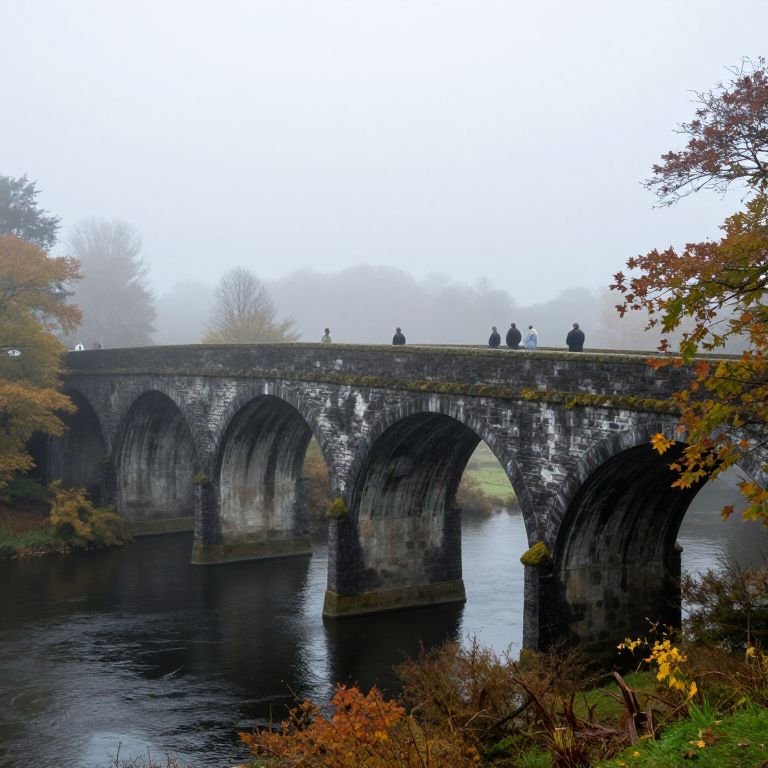 Misty morning reveals a serene stone viaduct spanning a tranquil river, its arched structure adorned with mossy textures and vibrant autumn foliage, while seven figures stand atop, gazing into the distance where another bridge recedes into the foggy horizon.