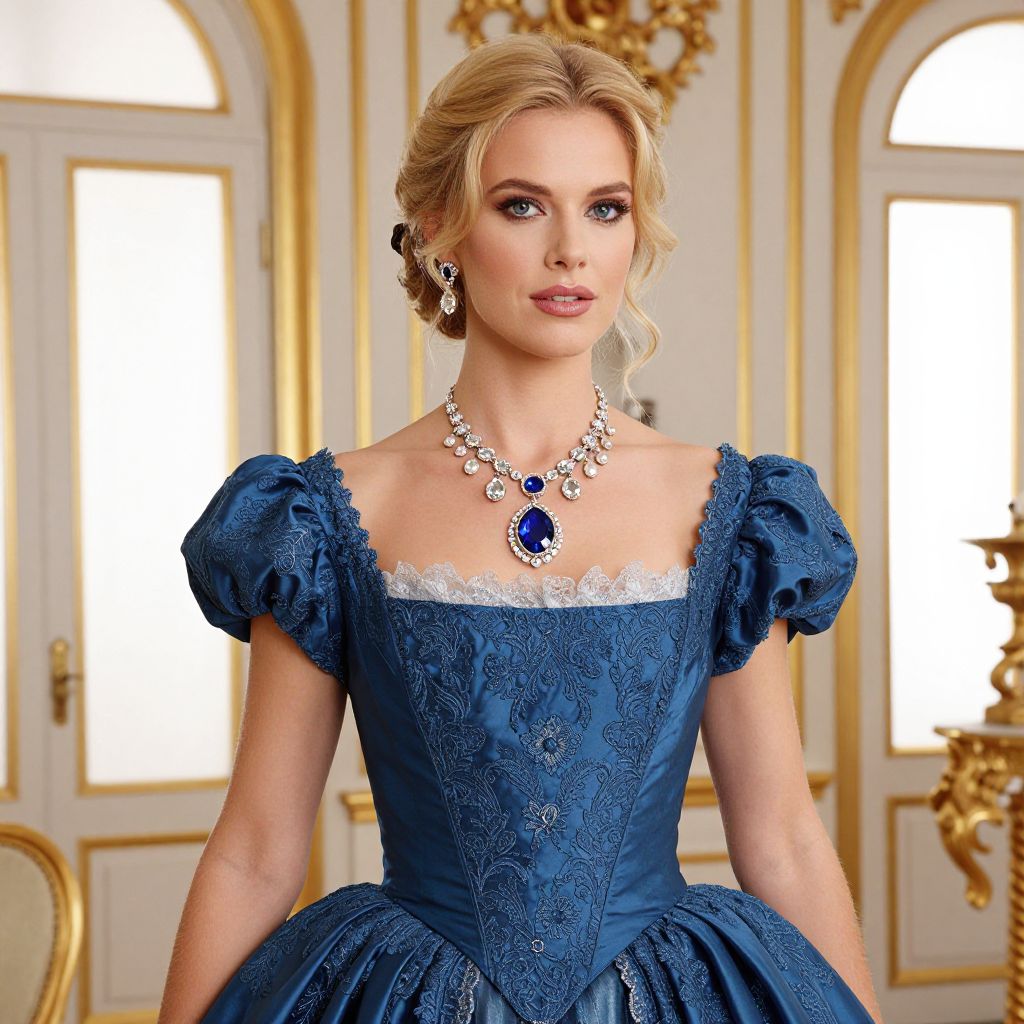 Elegant blonde woman adorned in a regal blue gown with puffed sleeves and intricate lace detailing, accessorized with a sparkling necklace featuring a prominent blue gemstone, set against a luxurious backdrop of gold-trimmed windows and ornate decor.