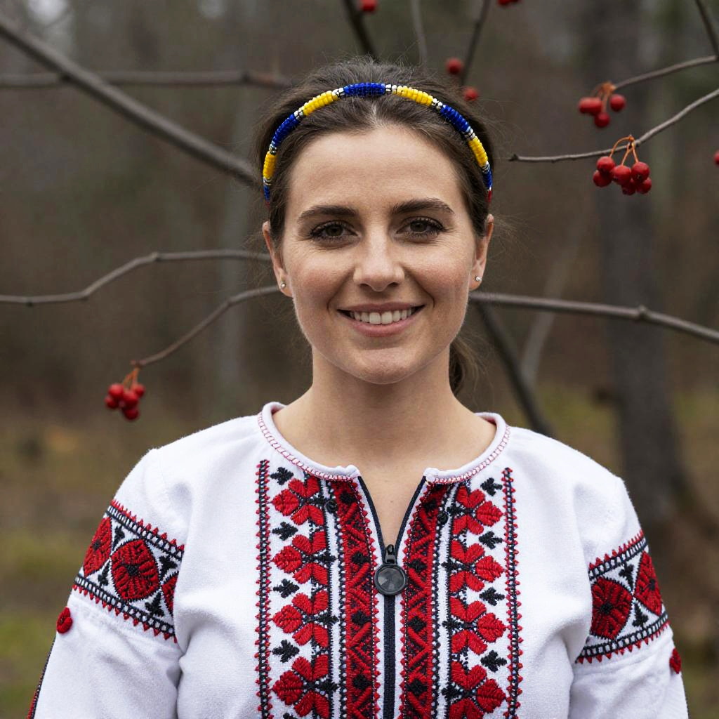 Woman with fair skin, smiling, wearing a multicolored beaded headband and intricate white and red embroidered blouse, standing in a forest with red berries on bare branches in the background.