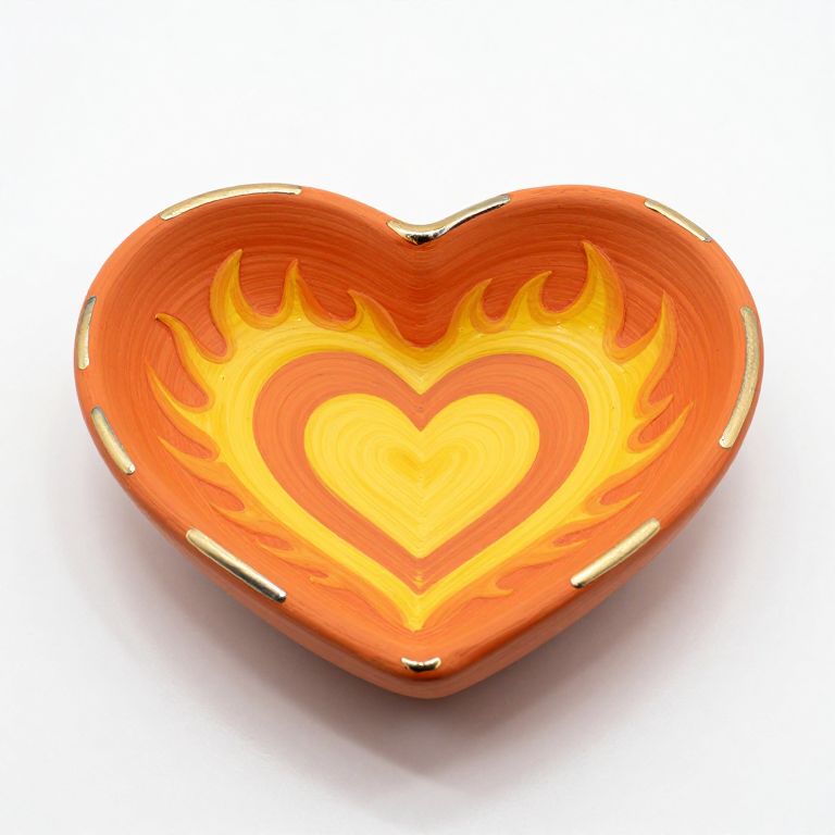 Heart-shaped clay bowl featuring a vibrant orange flame design with concentric yellow hearts, adorned with metallic accents along its rim, resting on a plain white surface.